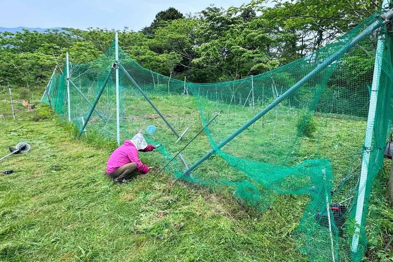 奥の方では、柳田さんが枯れてしまった果樹の周りの草を刈っています。牧草は剥がしてあり一度穴を掘った場所なので、草を取った後にモウイを植えてみます。ネットの畑の中では塩谷さんが育てて成功しています。