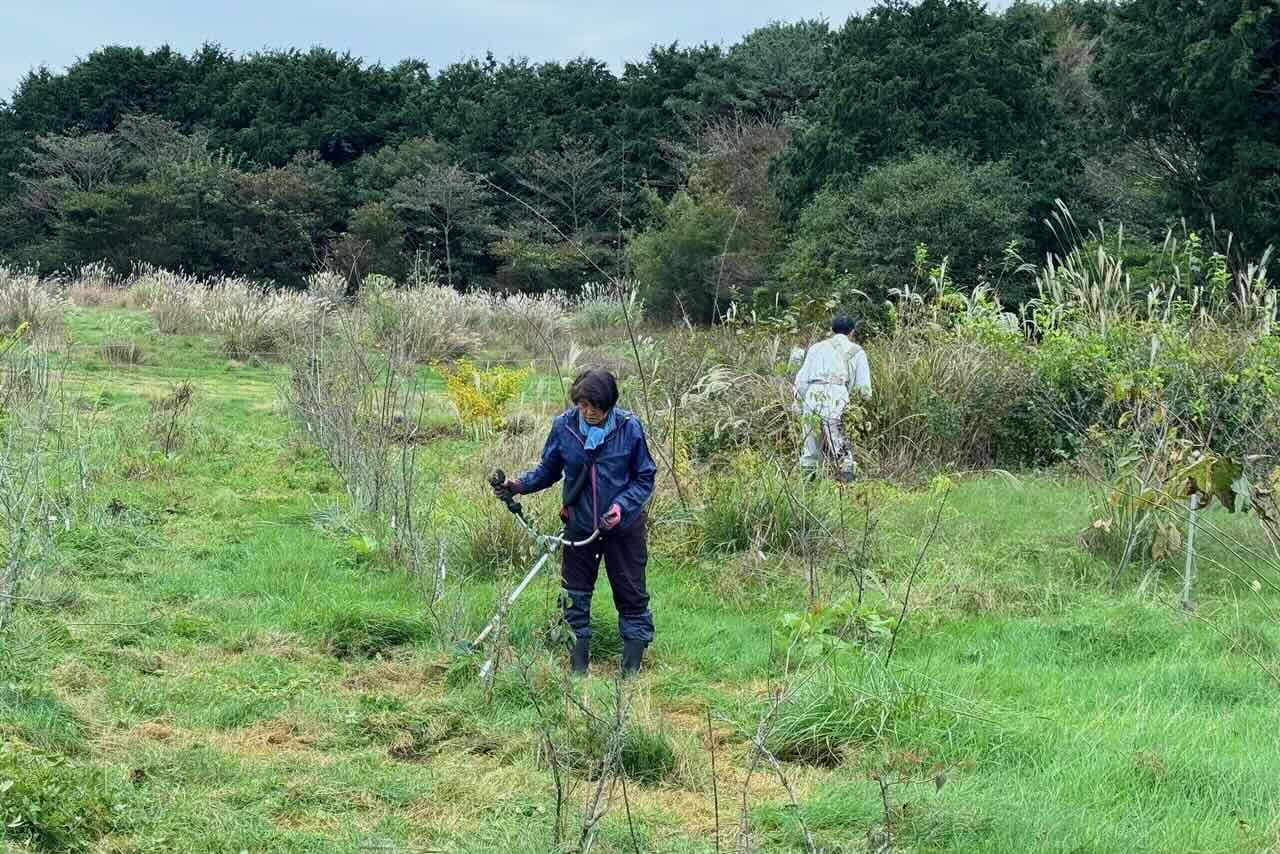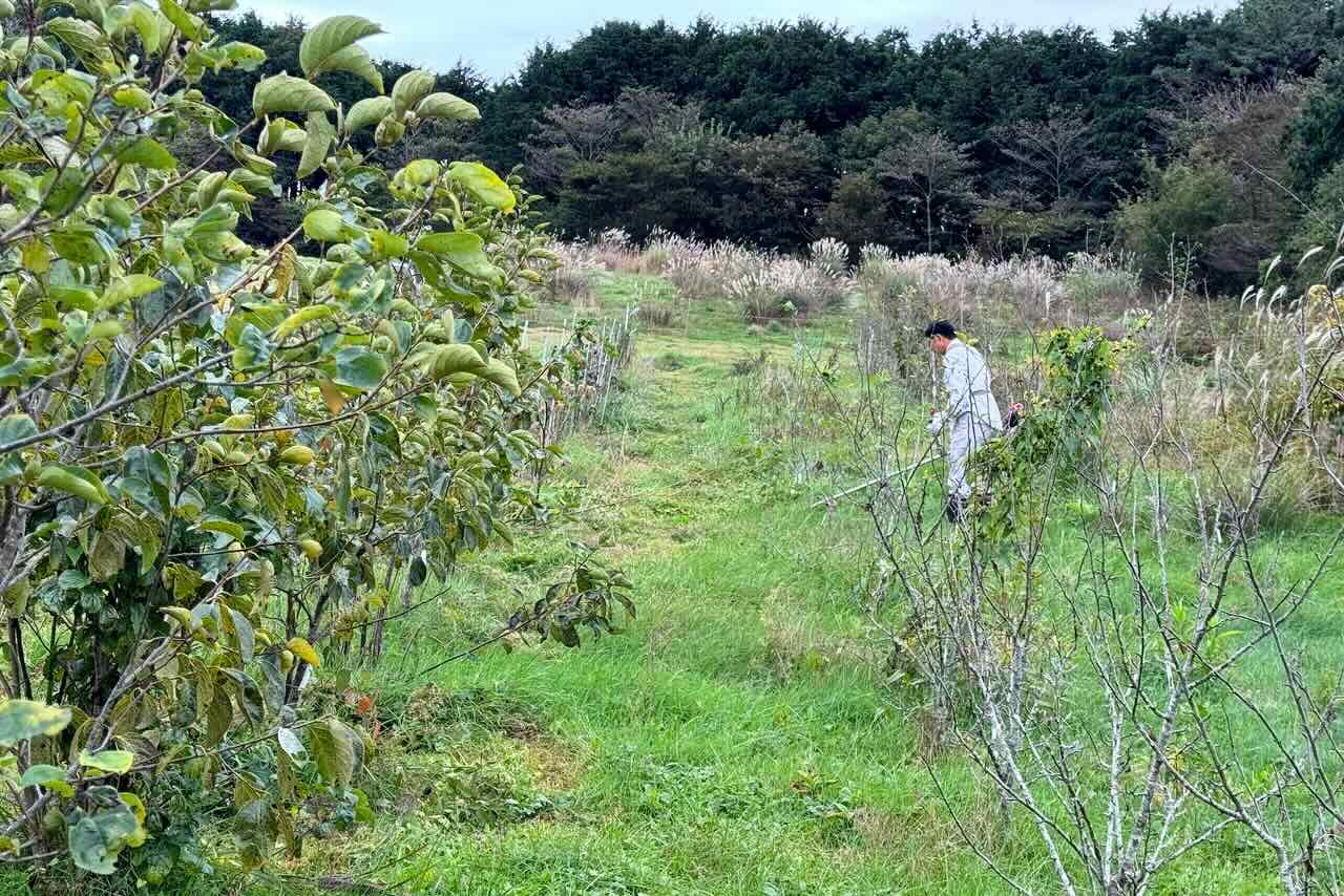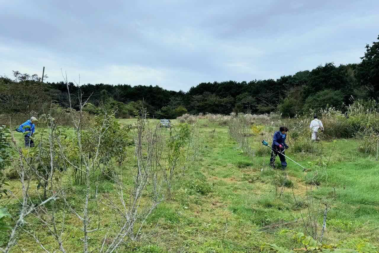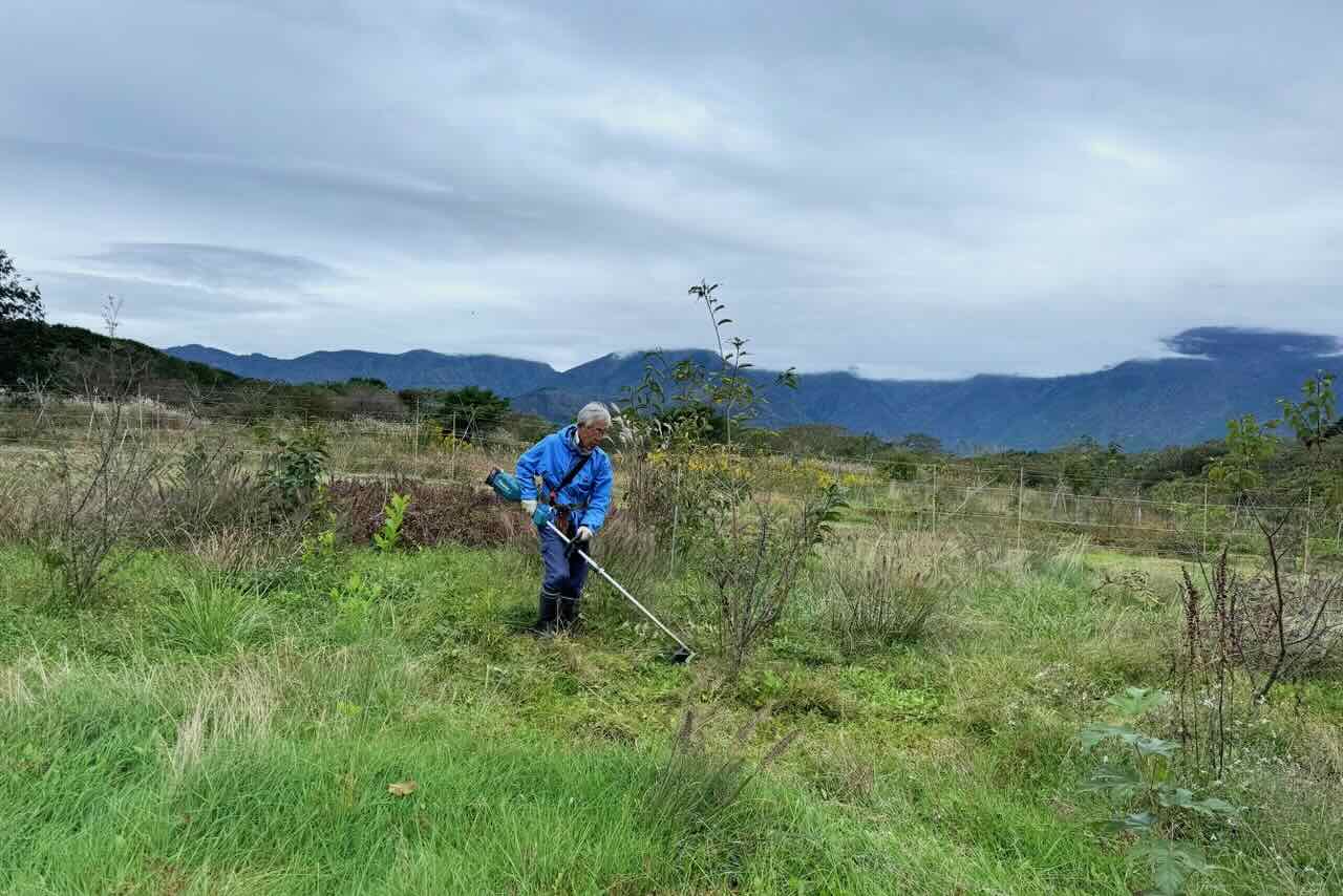 20日9時、宝山に7人集まり、第1電柵内の果樹周りの草刈りをしました。今までに何回か中村君が草刈りをしてくれていましたが、防寒防霜用に果樹の根元に草を集めるように刈りました。