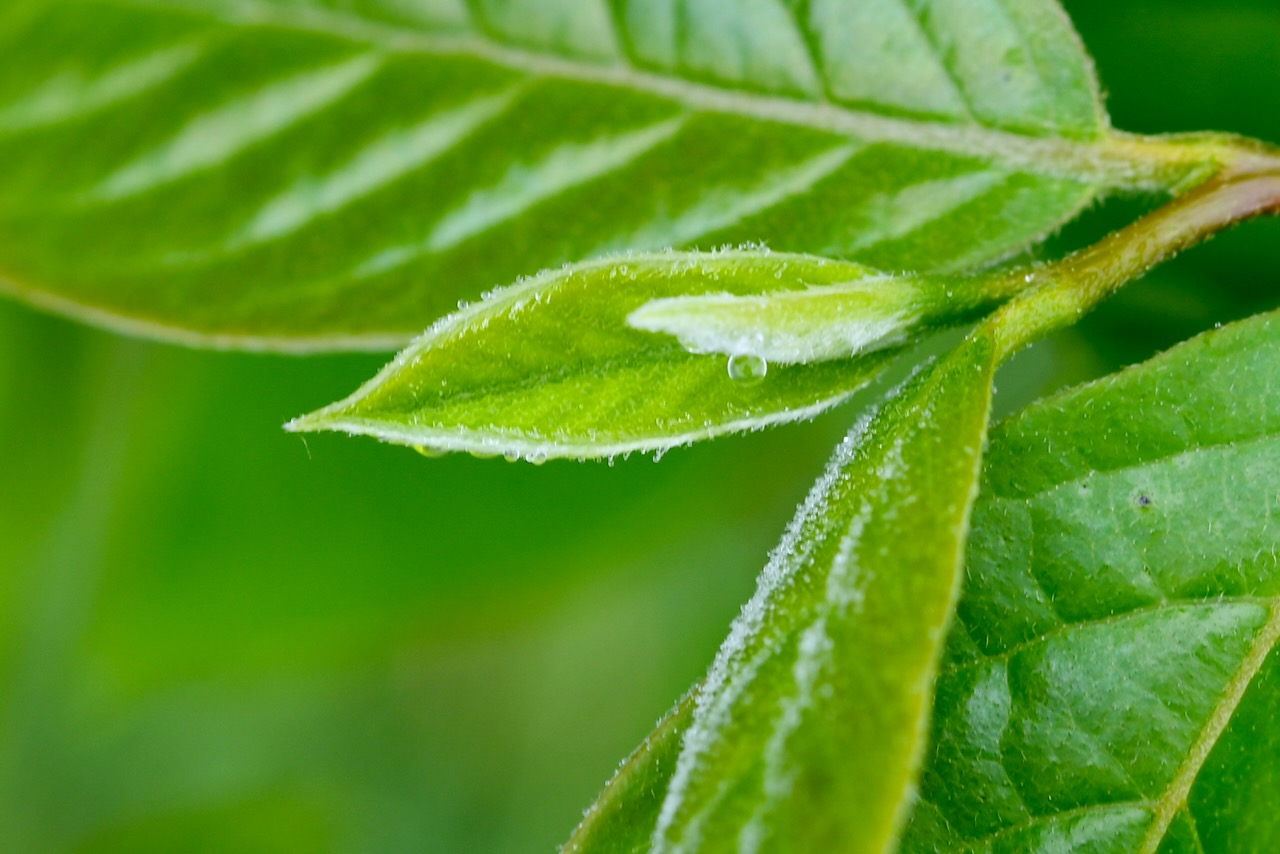 新芽に水滴が付いています。可愛らしいです。