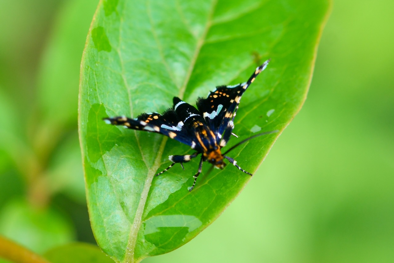 マドガが止まっていました。15mm程のとても小さな虫です。「水色っぽい色の紋が半透明で窓をイメージさせるところからマドガという名が付けられたようです。」(ネットから)