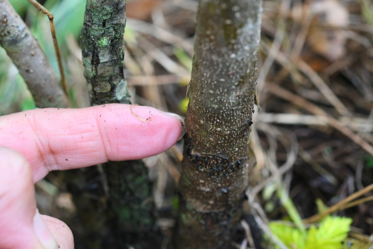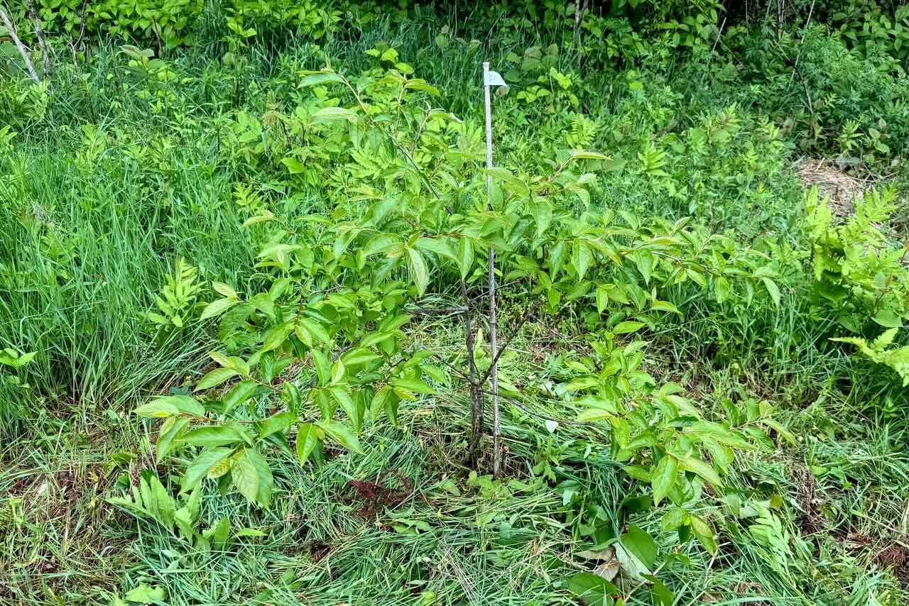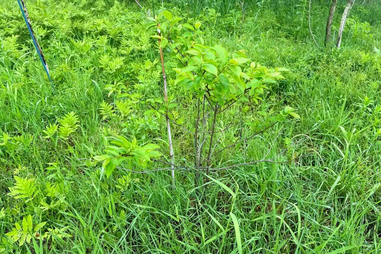 アマンドウは石英安山岩の実験をするために、2本は掘った穴に何も入れない、2本は石英安山岩を下に入れる、2本は上に入れる、2本は土と混ぜて入れる、2本は何もしないが感謝と祈りをする、という条件で植えました。それから年に一回草を刈るぐらいで何もしませんでした。すみません、祈りも感謝もほとんどしていません。その結果を報告します。この細い幹は何もしなかったアマンドウです。