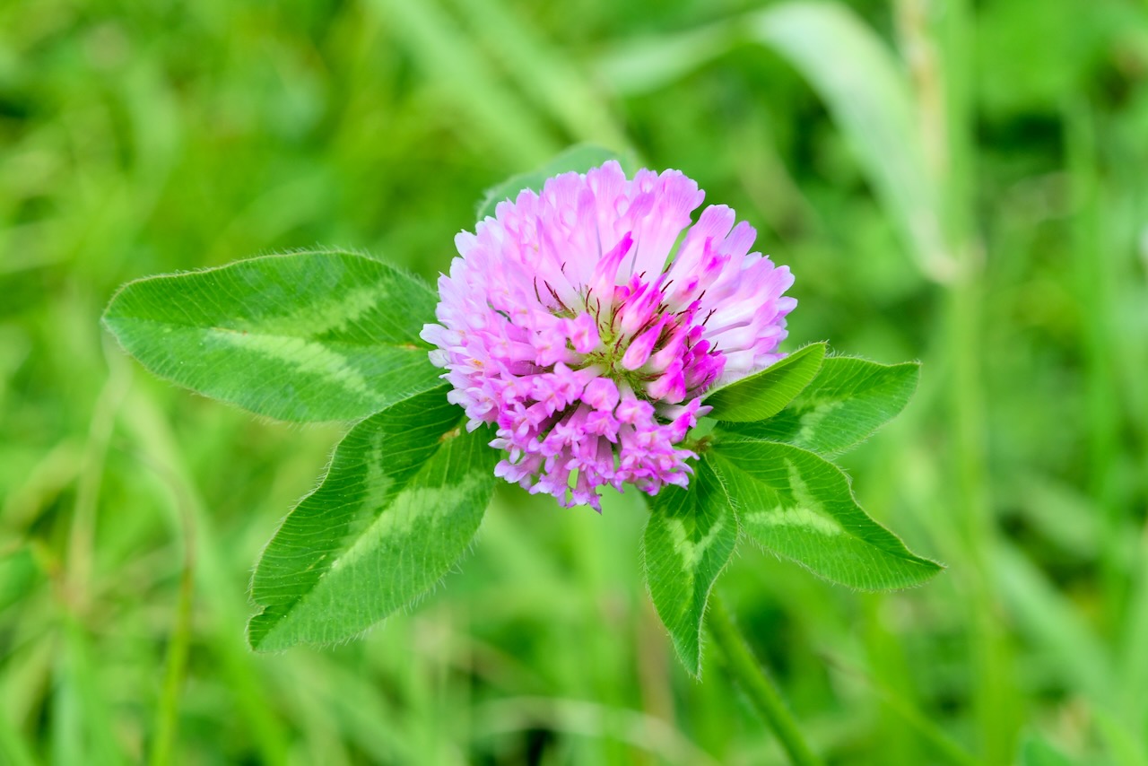 撮影の為に留めていた空き地の足元を見ると、ムラサキツメクサ(アカツメクサ)が咲いていました。聖地ではまだ見ていません。