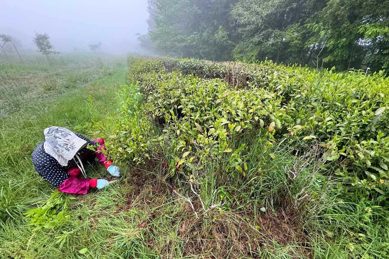 私が草刈機で刈り、柳田さんが草刈機で刈れない茶の木のギリギリのところを刈ります。