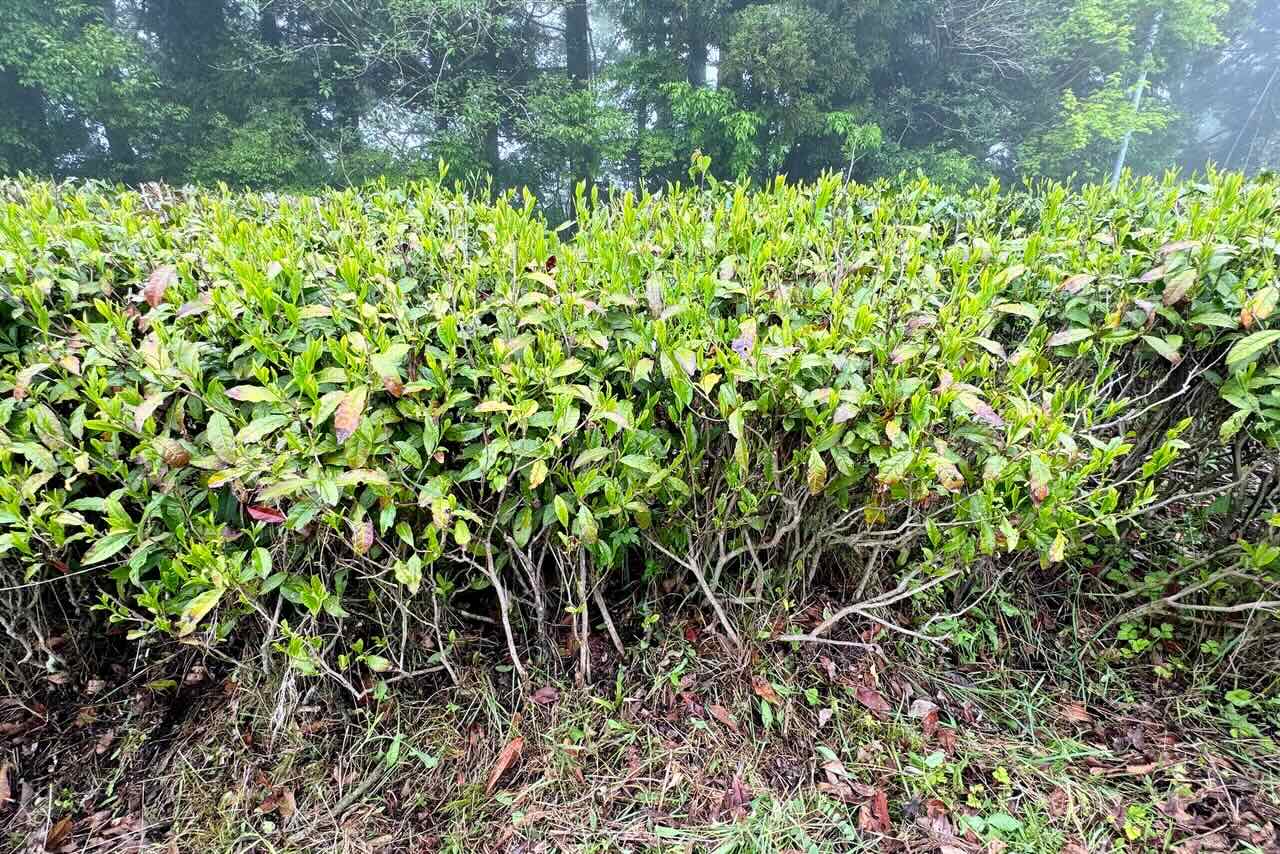 メインの通路沿いに植えている茶の木のきわを刈って行きます。入り口から奥に向けて撮った写真です。