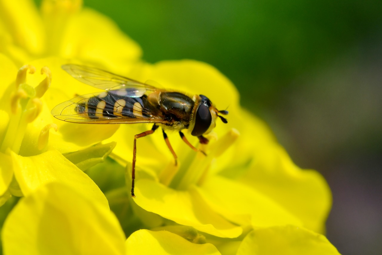 この子はフタホシヒラタアブです。よくミツバチと飛んでいます。なんと8〜10mmの小さな子ですが、光線によって羽が輝くのが好きです。上手く撮れれば虹色に光ります。