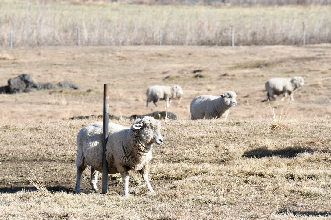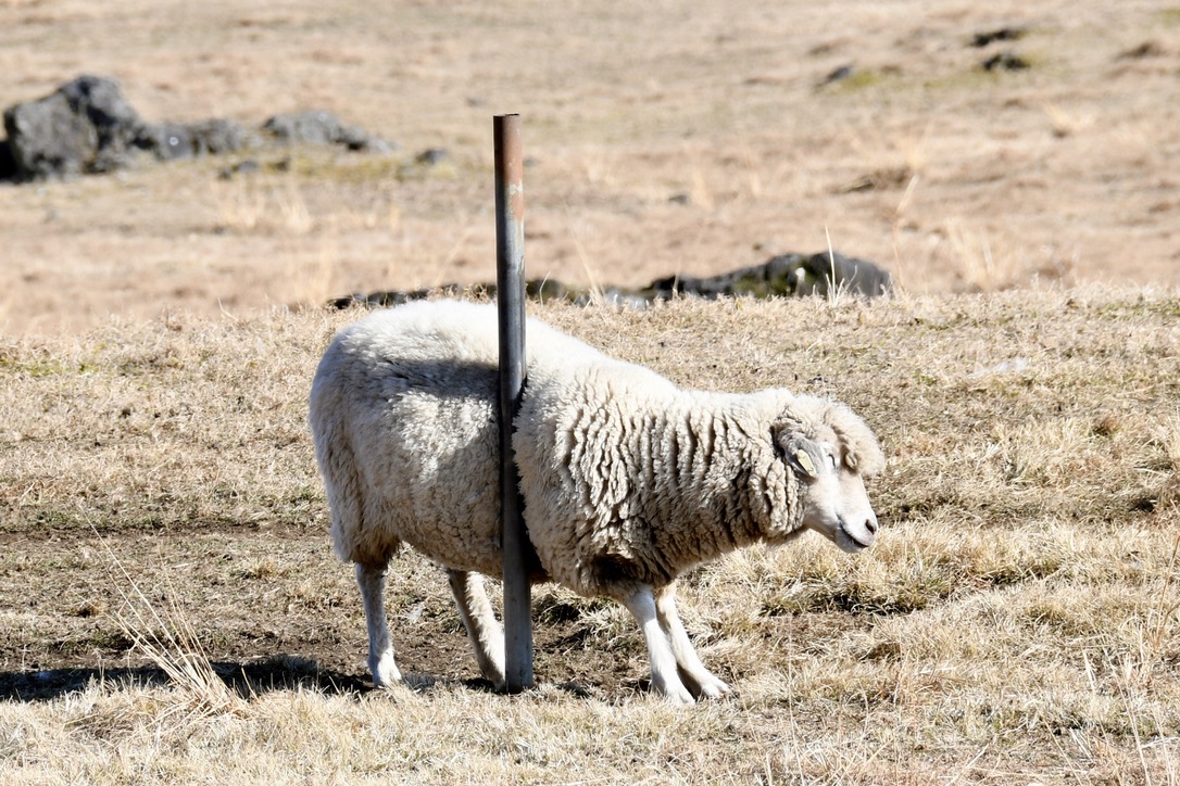 羊さん達も気持ち良さそうです。この日は最低気温がー2°で、最高気温が11°もあったので暖かいです。左から来る羊さん達が次々とこのポールに体をこすりつけて行きます。体がかゆいのでしょうか?