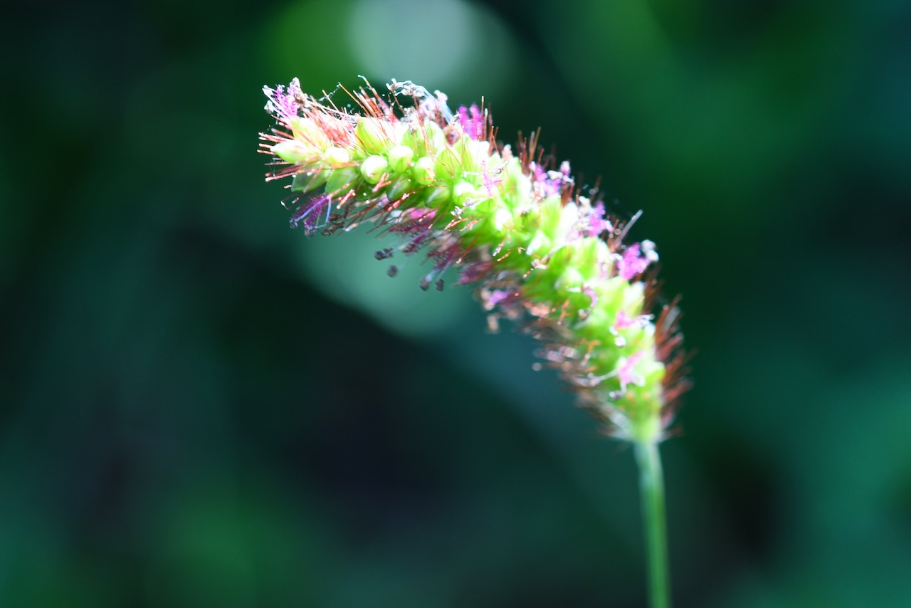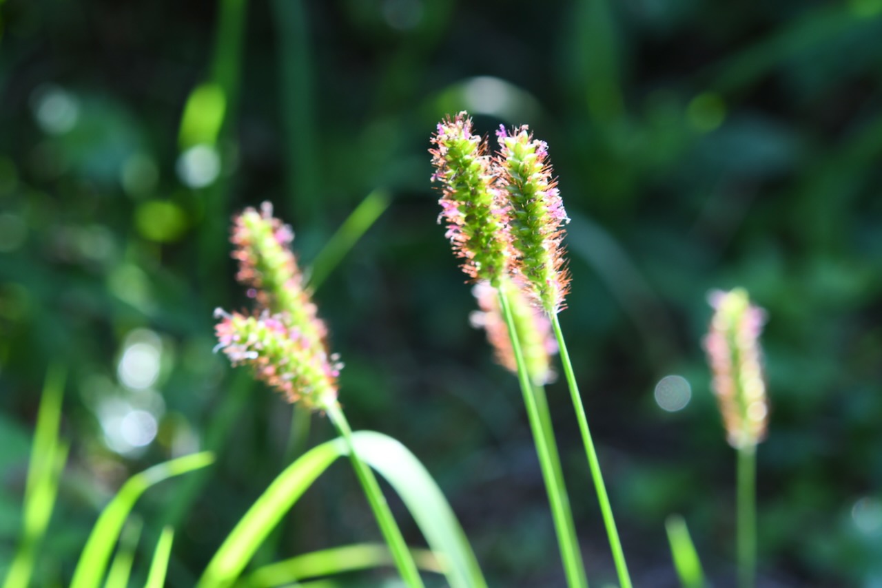 富士聖地の植物。キンエノコロ、チヂミザサ、ツリガネニンジン、イヌタデ、カタバミ、フジナデシコ、銀木犀と金木犀