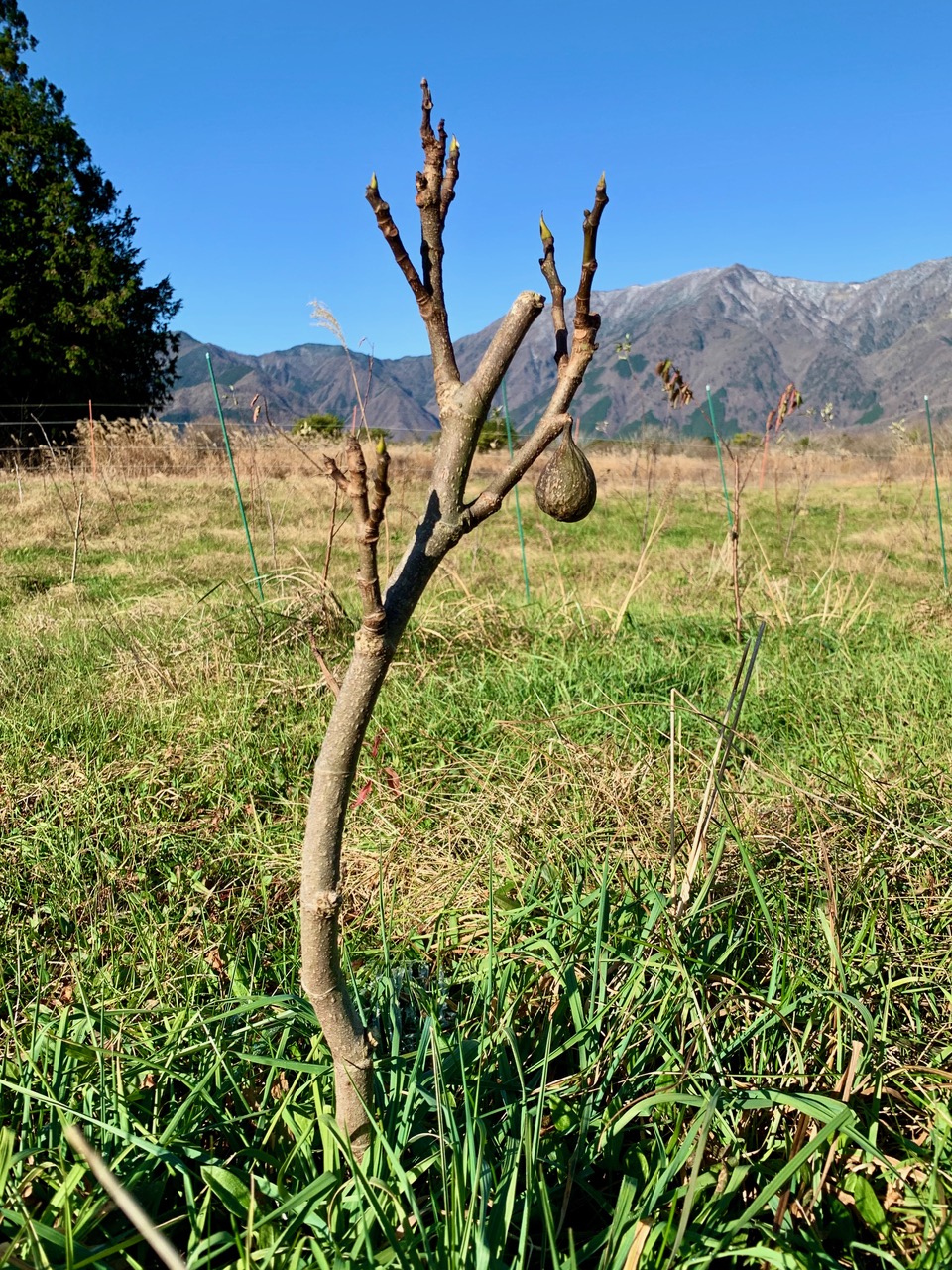 何の木かわかりますか? この子はまだ一年生のイチジクの苗木ですが、一個だけ実をつけました。一生懸命な健気な姿に感動しました。実は取らずにそのままにしています。草原の苗木達も草にびっしり覆われて何だか暖かそうです。