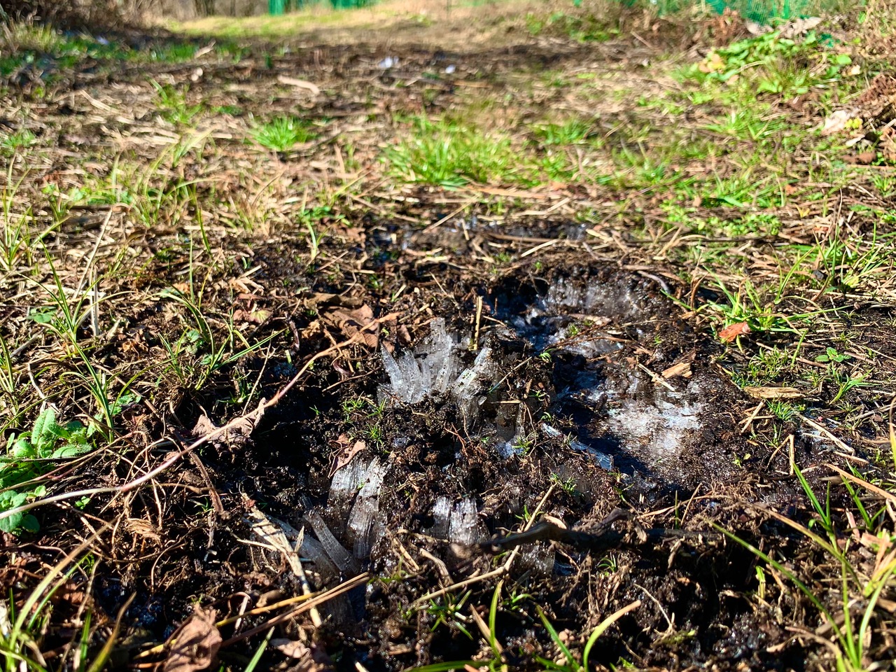 通勤道の両サイドにはまだ雪が残っていたので、宝山に雪が降ったかどうか、野菜や苗木は大丈夫か見に行きました。ユンボで作った遊歩道には、霜柱が立っていましたが、雪は降らなかったようです。
