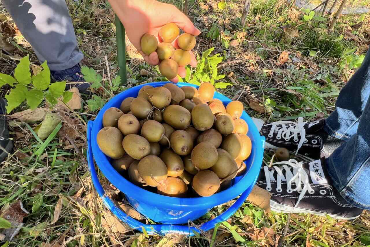 笹の作業を終えてから、残りのキウイを収穫しました。塩谷さん親子は背が高いので、高い場所のキウイを取ってくれています。
