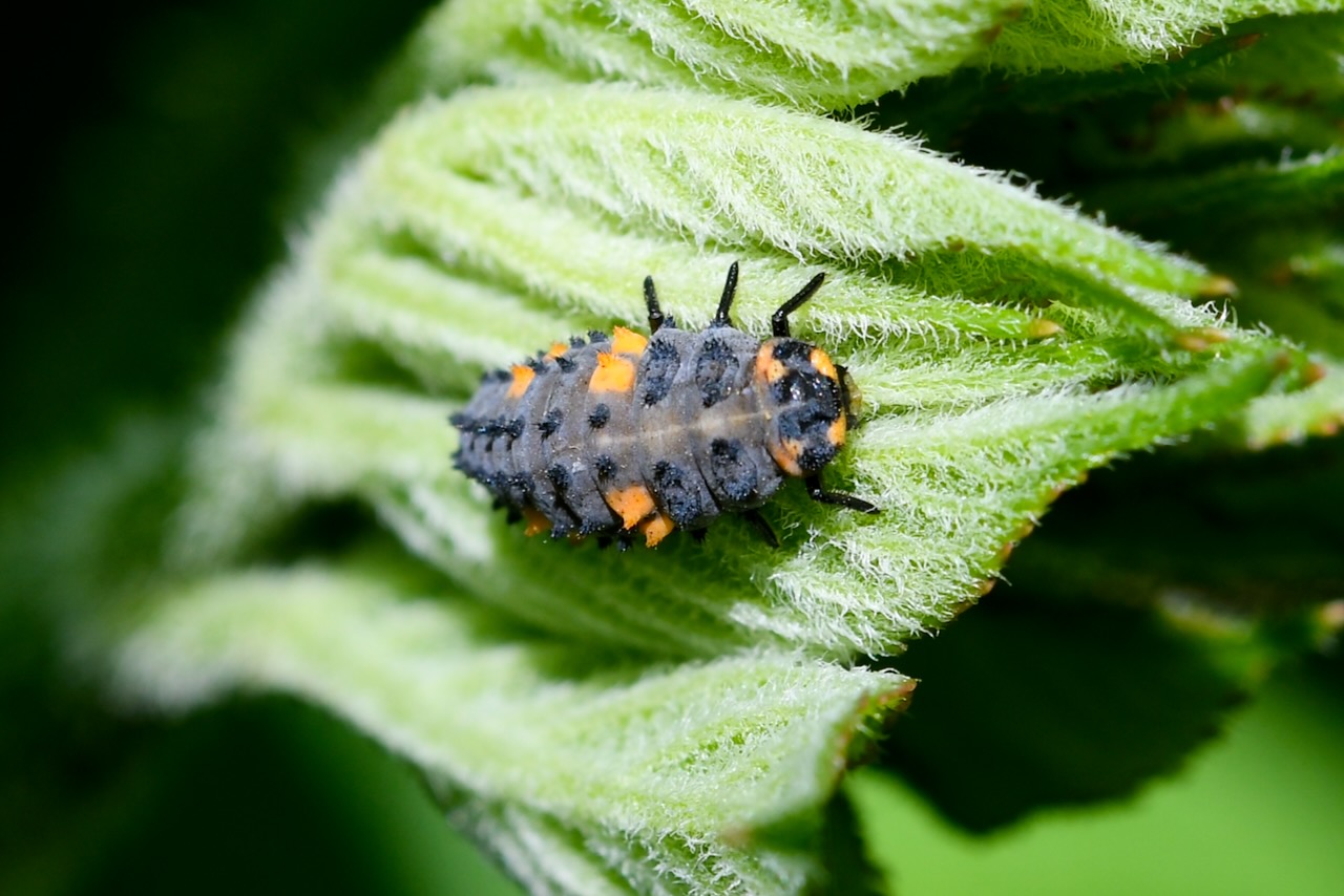ヤマウドの新芽を摘んでいると、小さな虫がいました。ずんぐりしています。調べるとナナホシテントウの幼虫でした。