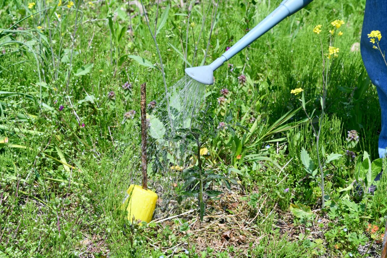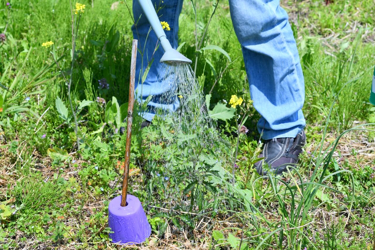 9日に植えたトマトの苗にも水をあげていますが、、、 柳田さ〜ん、それは杭の棒です、、、 昔、アルバイトのお店の鉢植えの花に毎日お水をあげていたら、絨毯が水浸しになったそうです。なんとそれは造花だったのでした。すごい。