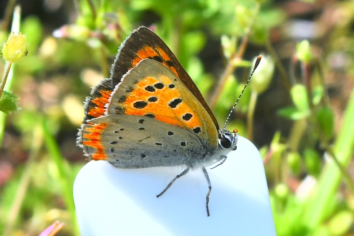 野菜のそばに刺している名札に、ベニシジミが止まりました。可愛すぎます! お目目もクリッとして愛らしいですが、触覚の先のオレンジ色の膨らんだ部分が好きです。