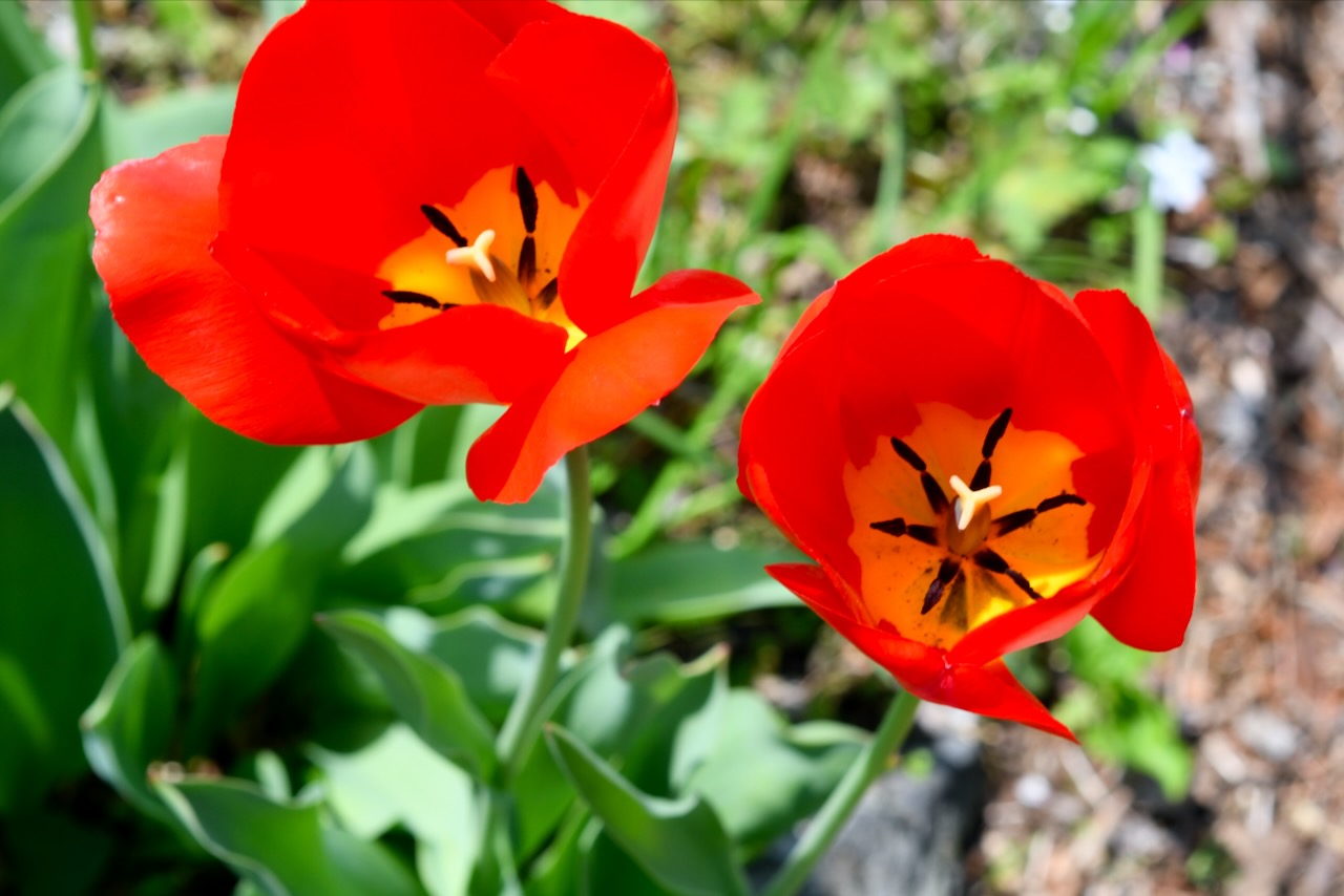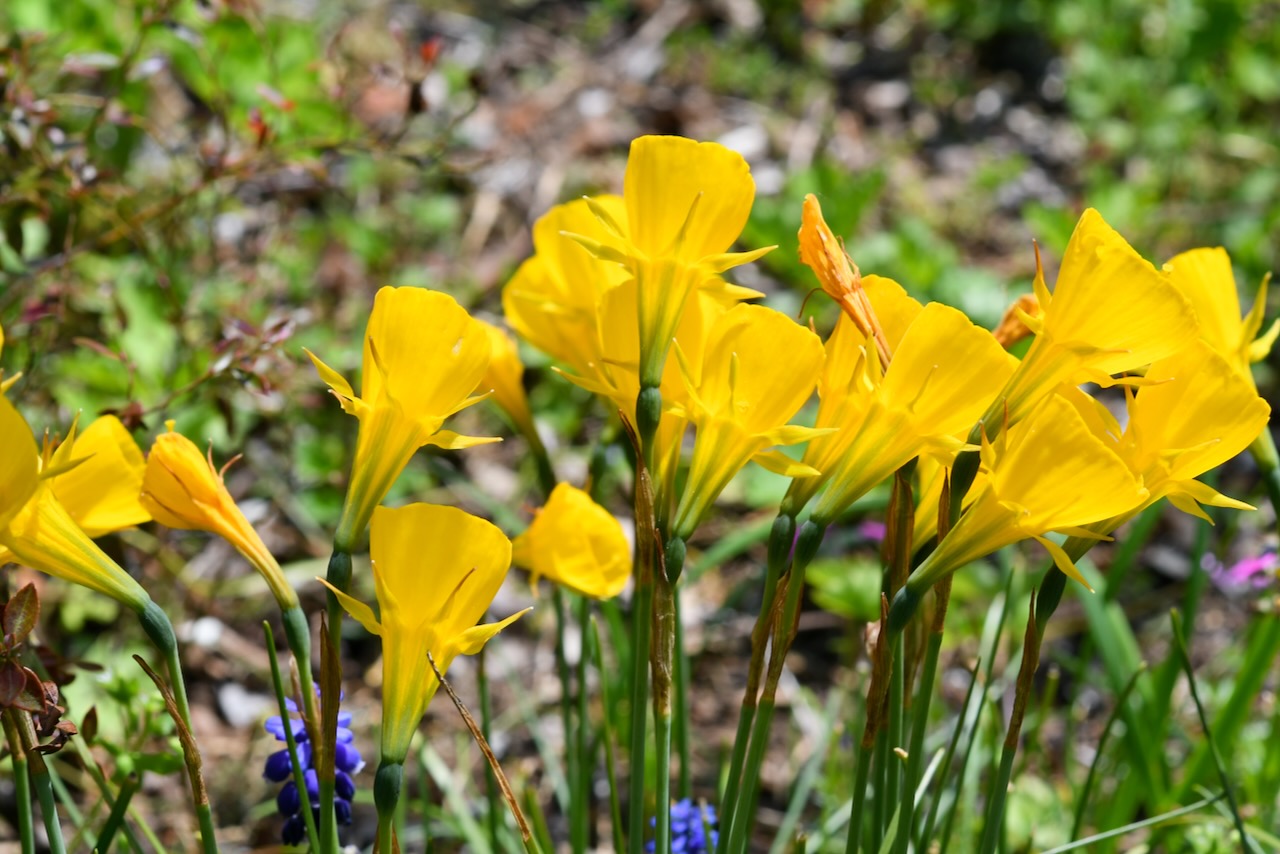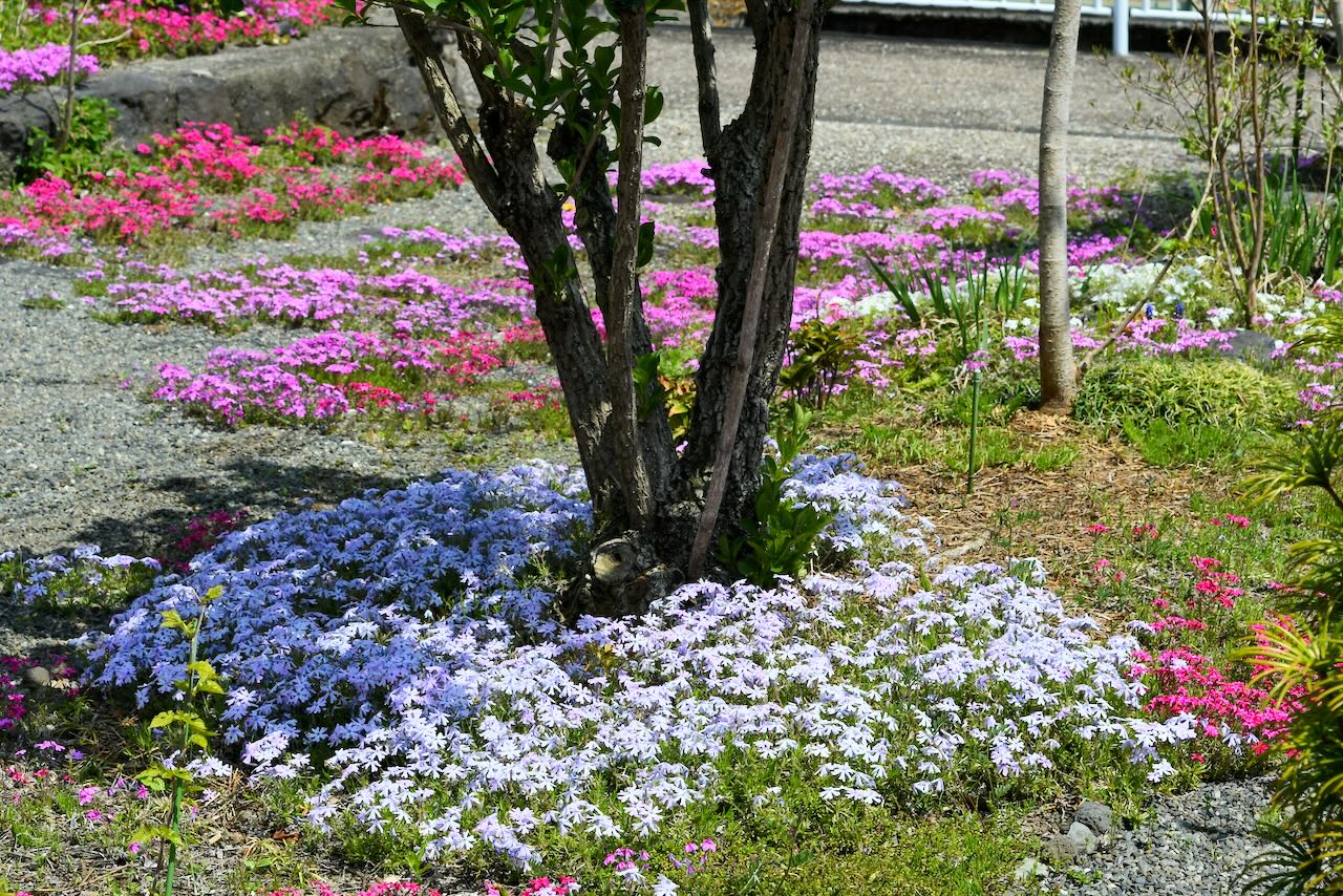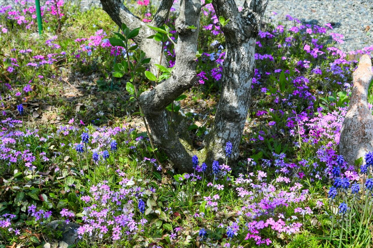古い木の周りに可愛らしい芝桜やムスカリが生えています。カラフルですね。