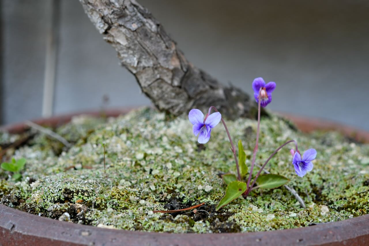 松の盆栽に、盆栽に合わせたような小さなスミレが咲いていました。