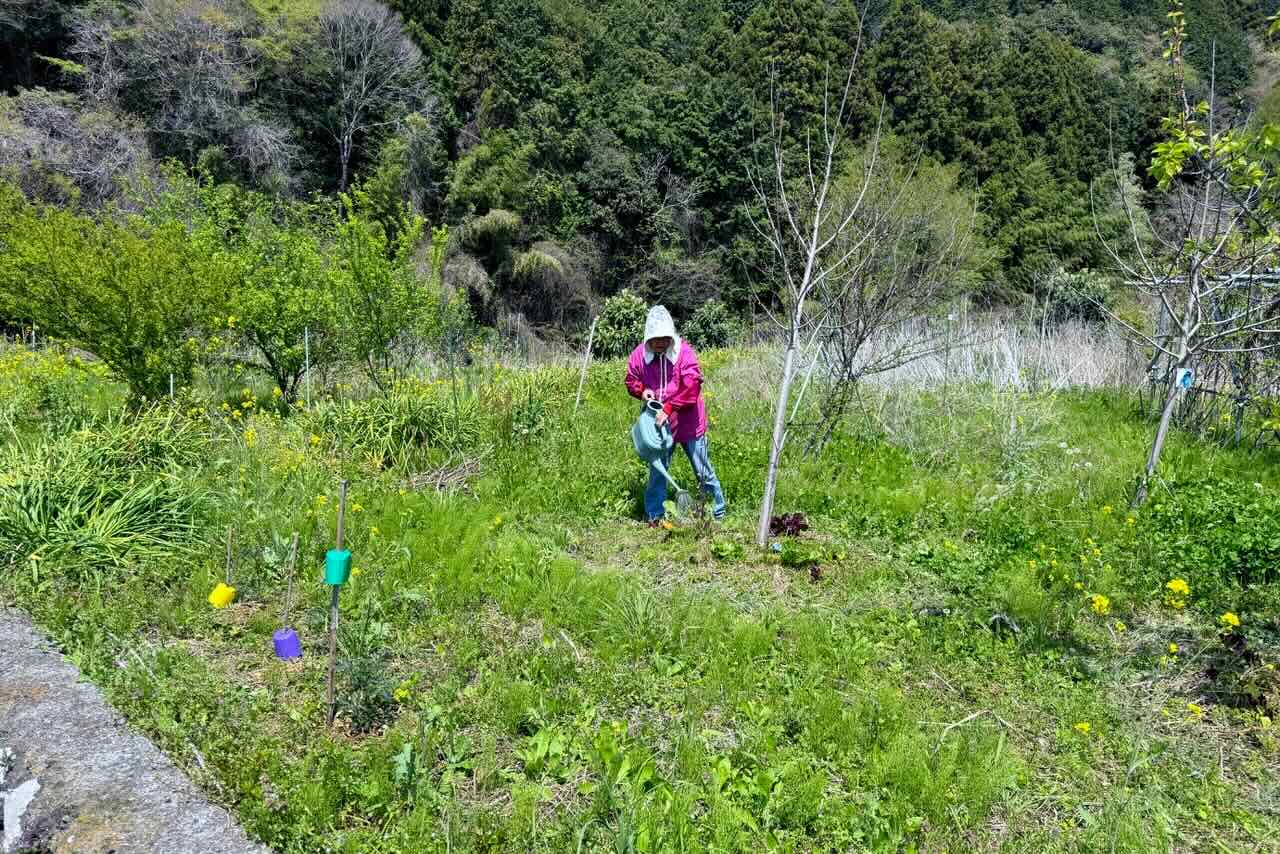 柳田さんが水をやっています。水は段々畑の一番下まで降りていかないと汲めません。