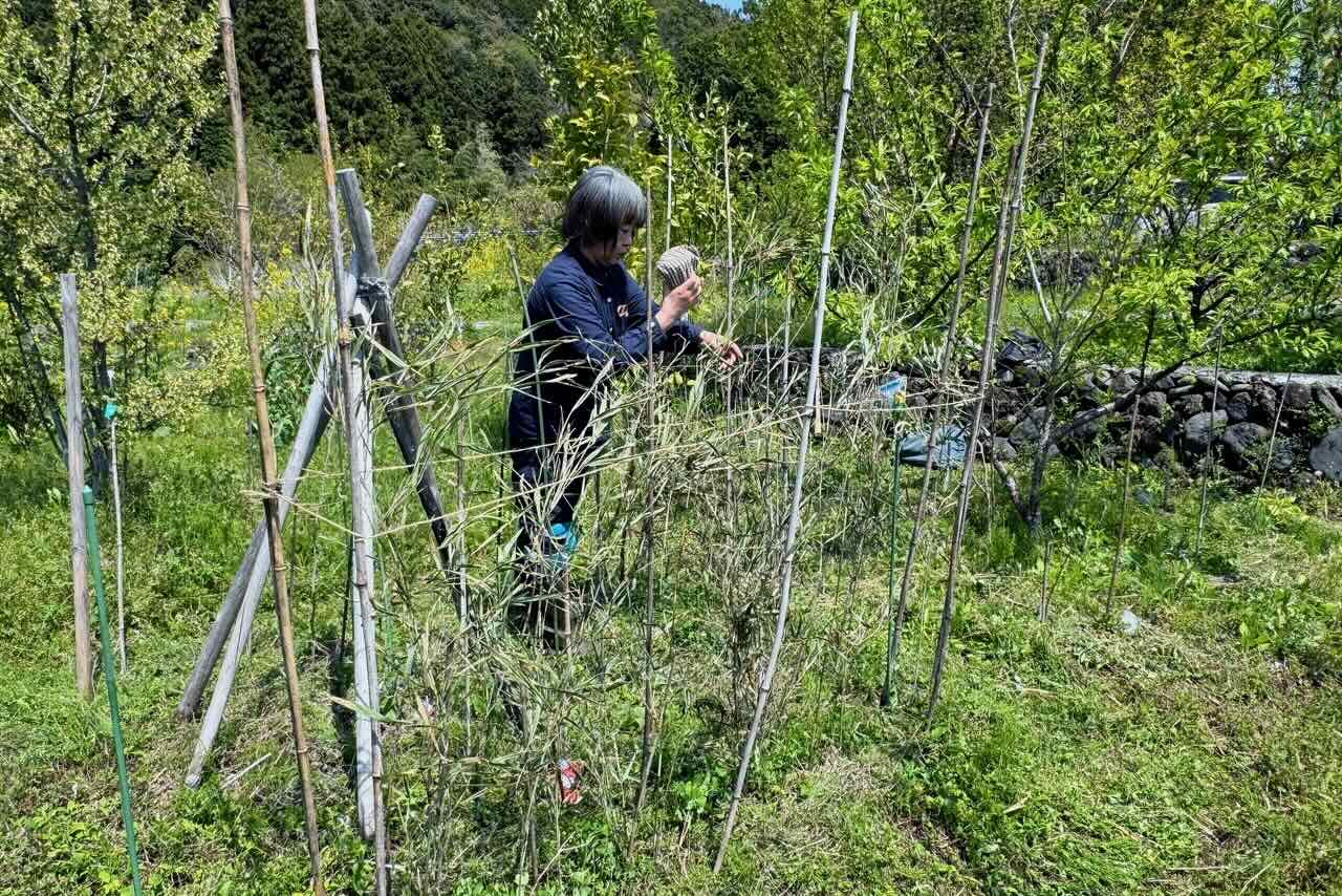柳田さんが、周りを囲った竹の棚を修繕しています。人と比べると竹の高さがわかります。