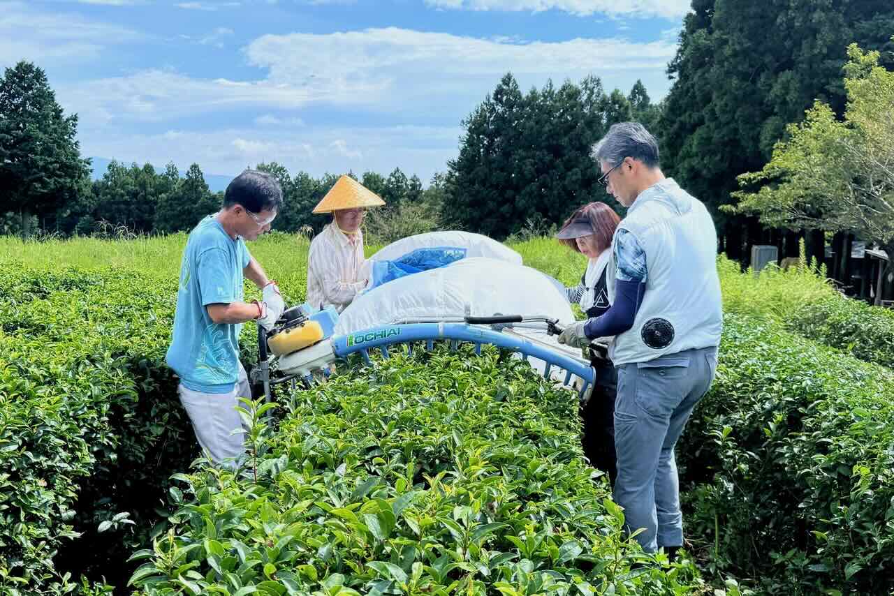 また、日焼けで部分的に茶色くなった茶葉もできるだけ取り除きました。2時間ほどツルや茶色い葉を取っていましたが、あまりの暑さに休憩しました。