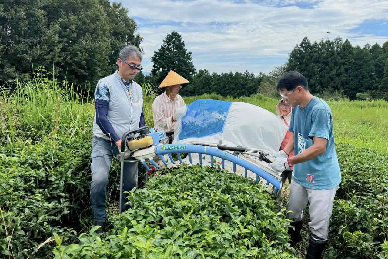 男性陣が機械を持ち、茶葉が舞い込んでくる後の袋を安田さんと女性陣が交代で持ちました。