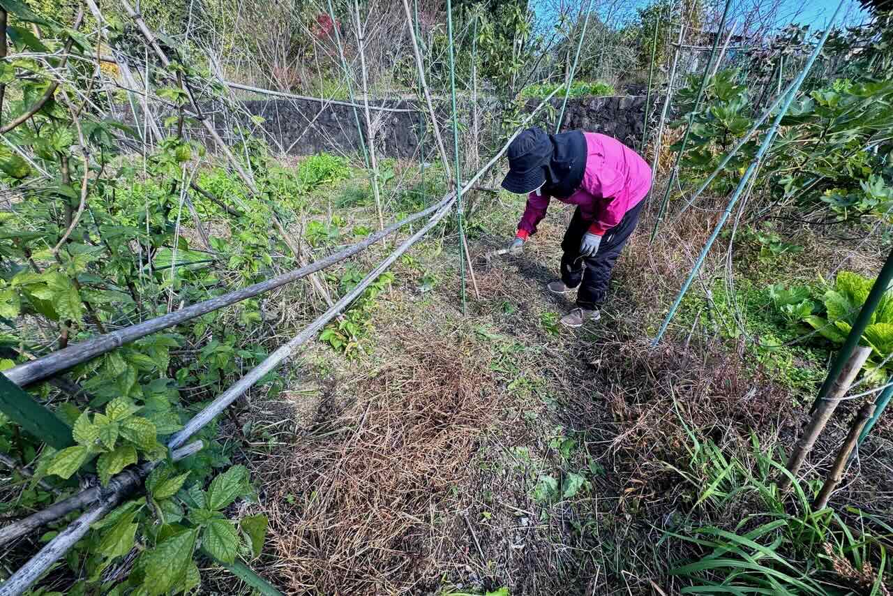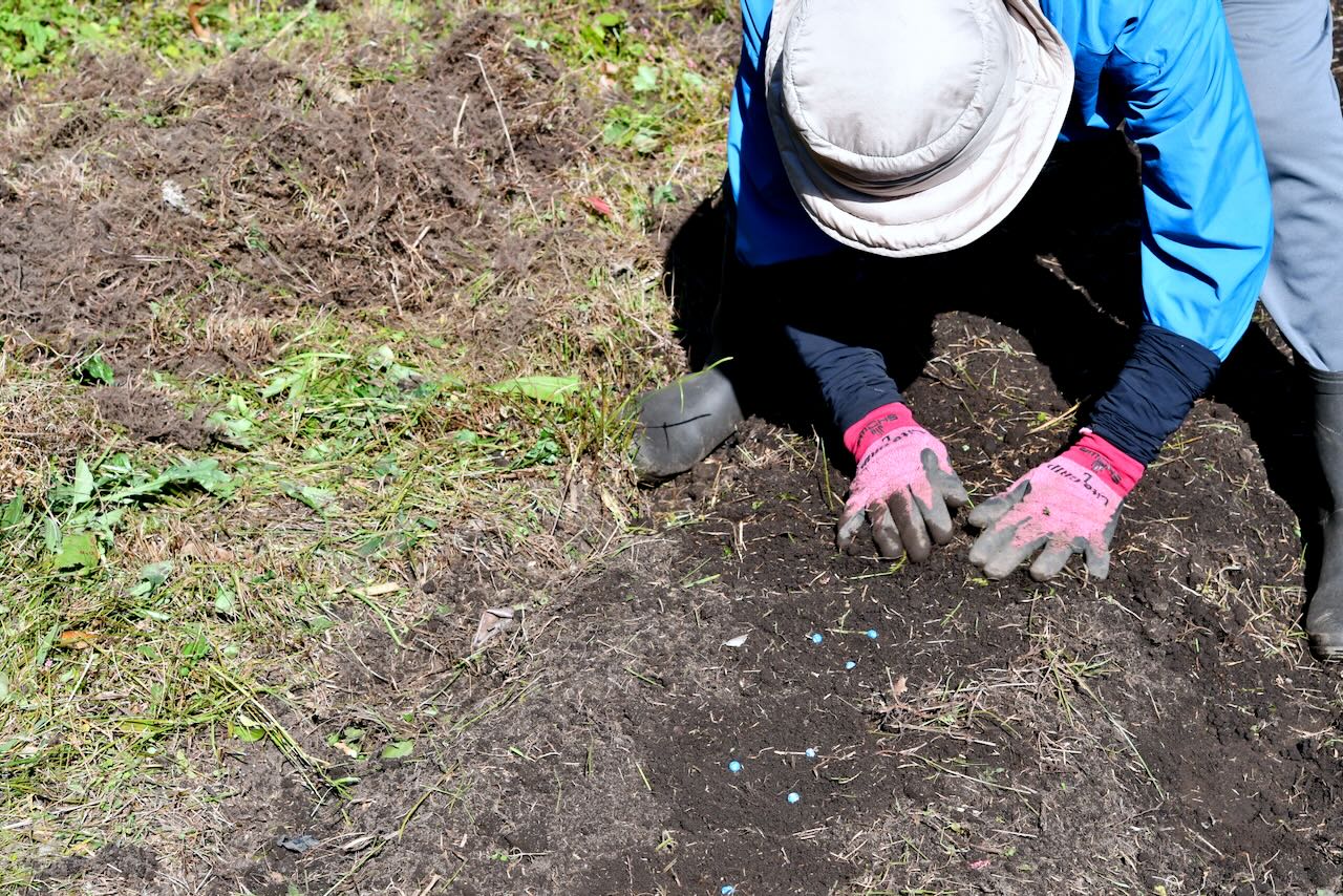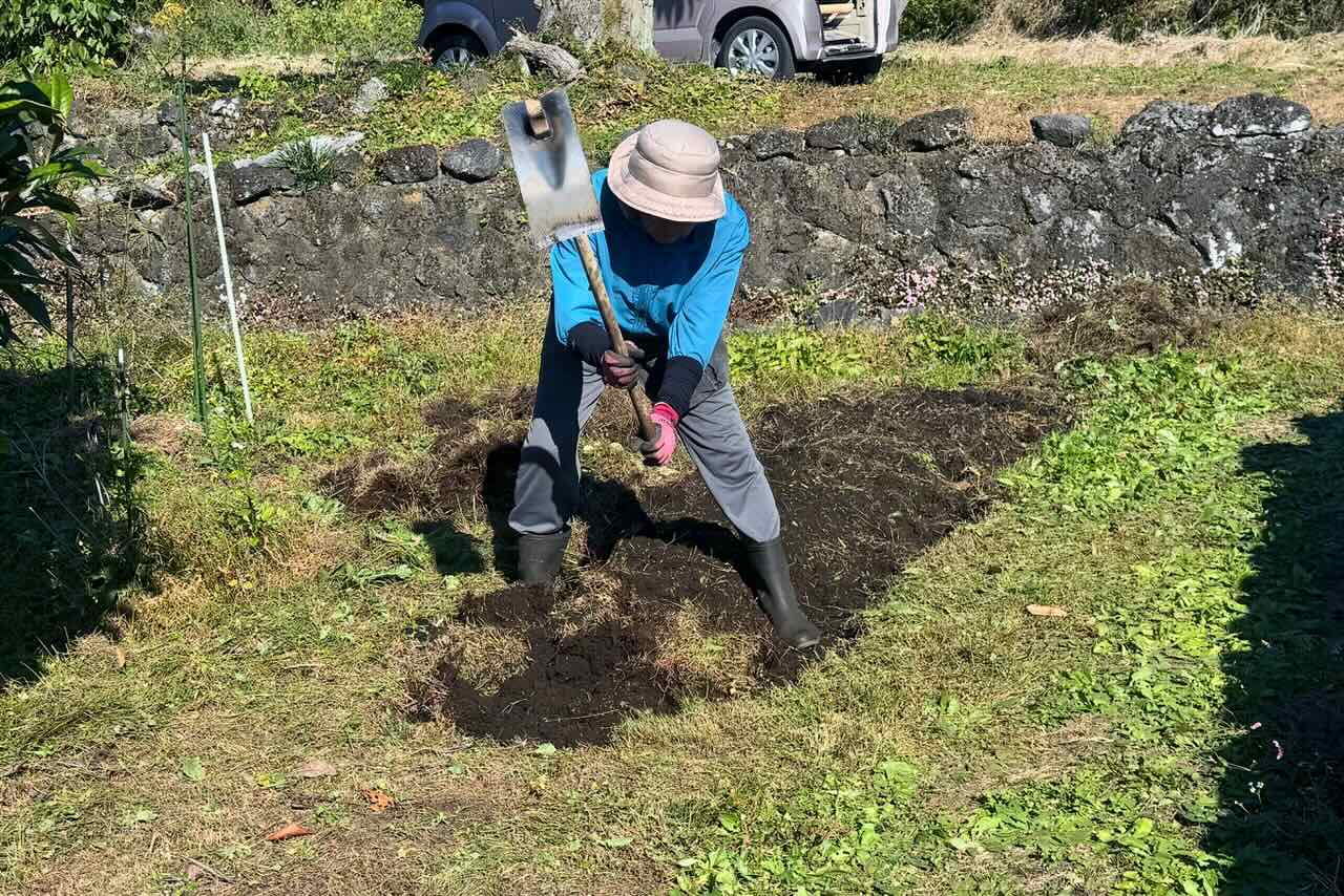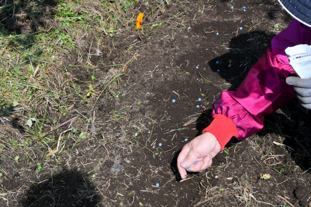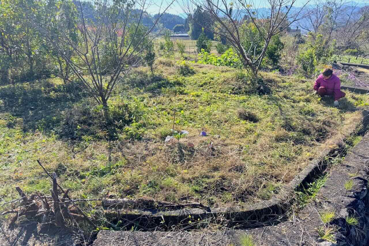 柳田さんはボコボコになった土から草を取り除き、種をまく真ん中の部分を平らにしています。