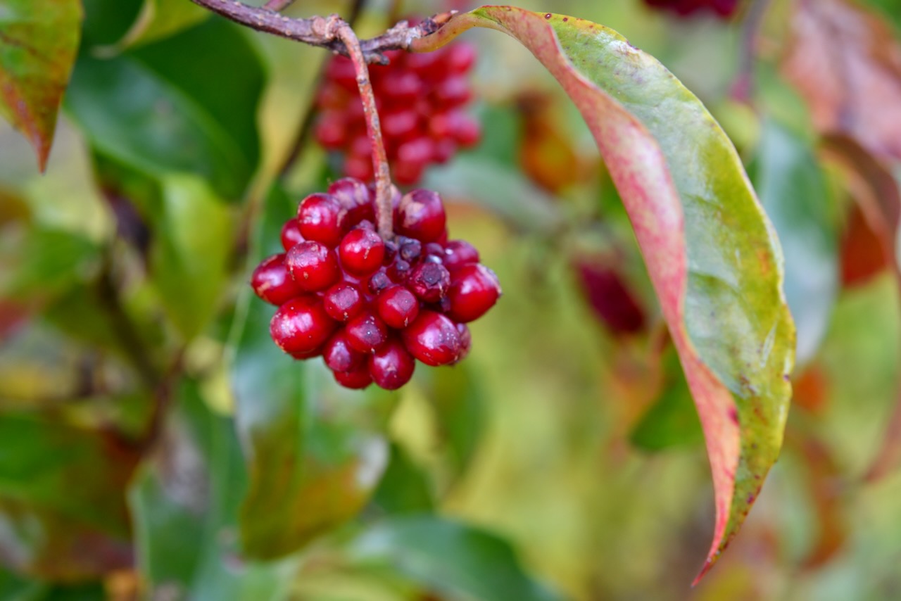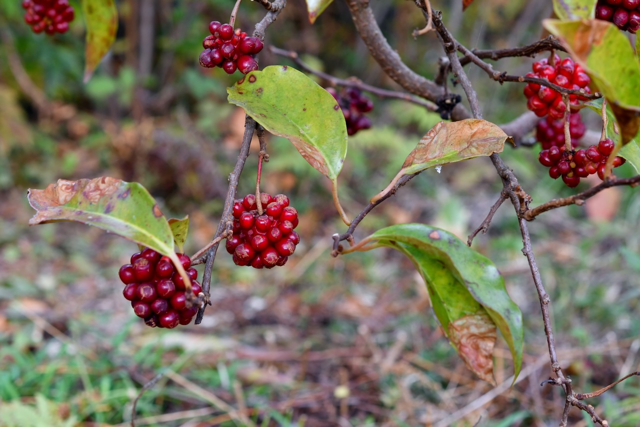 マンリョウ(万両) 赤く美しい実を価値のあるものとして名付けられた、センリョウ科の『千両』より、実が赤く大きいことから、さらに価値のある『万両』の名が付けられたといわれます。安田さんからはお土産にムベをいただきました。私からは大根をお渡ししました。