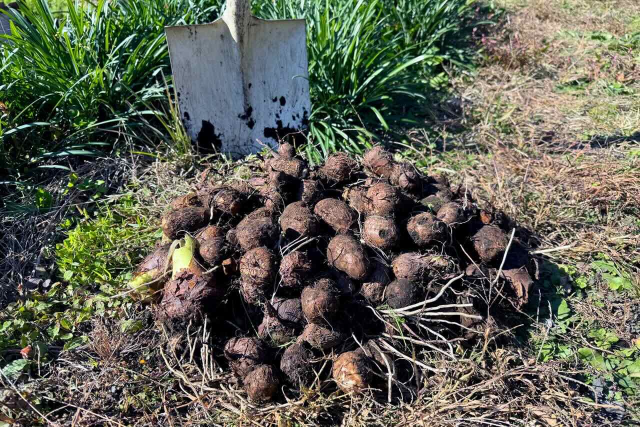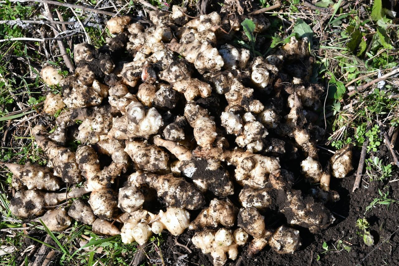 そのキウイの大棚の後にはキクイモが自生していますが、昨年から誰も収穫していません。草が3m近く伸びるので男性陣が草刈りをしていたので掘りやすかったのですが、芋が小さく何も出ない場所が多かったです。そこで少しスコップで掘った後、草の根の下を手で探っていくと、大きなキクイモに当たることが多くなりました。やっとこれだけ収穫しました。サトイモを掘った後、柳田さんがヤーコンが欲しいと言うので、3段目のヤーコンを掘ったのですが、「これは違う!」と言うのでもしかしてキクイモ?と聞くと「そうだった、それそれ」と言うのでヤーコンは3本だけいただきました。ヤーコンは見た目がサツマイモにそっくりです。キクイモはショウガのようにボコボコしています。なぜ間違えるのかわかりませんが、この後もこのキクイモを見てヤーコンと呼んでいました、、、柳田さん、名前覚えようね。。。