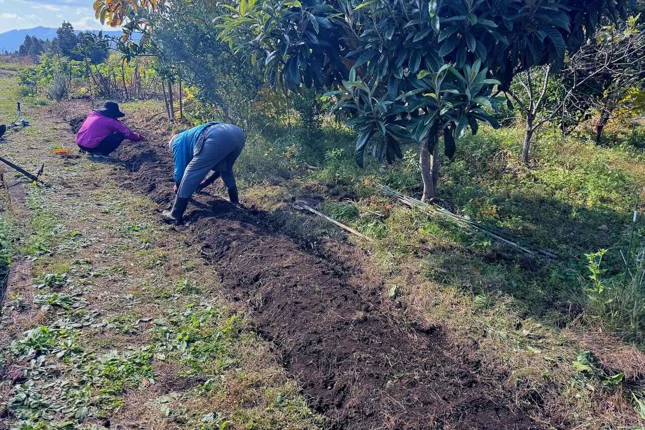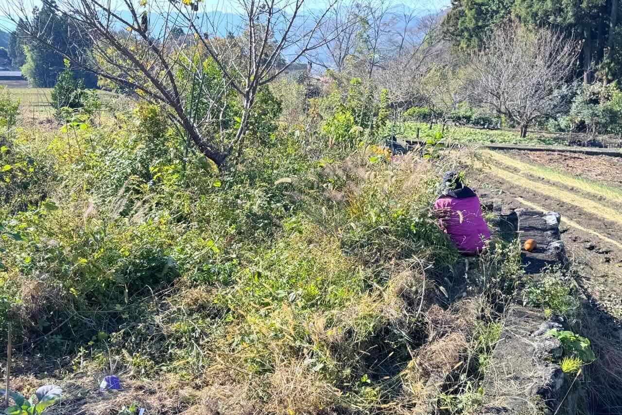 隣の田んぼとの間の通路に沿って20m近くの長さの畝になりました。この場所は初めて畝を作るので耕しましたが、今後は耕しません。私も奥の方から半分は耕しました。種を蒔き終わった後、草を被せています。
