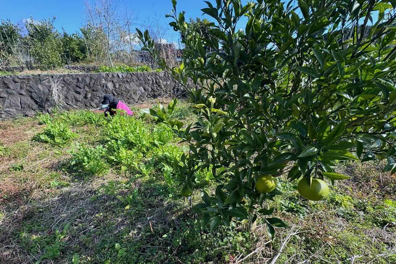 各畝には果樹が植えてありますが、この木に実がなったのは初めてだと思います。なんのミカンか名前はわかりません。この畝には大根を育てています。