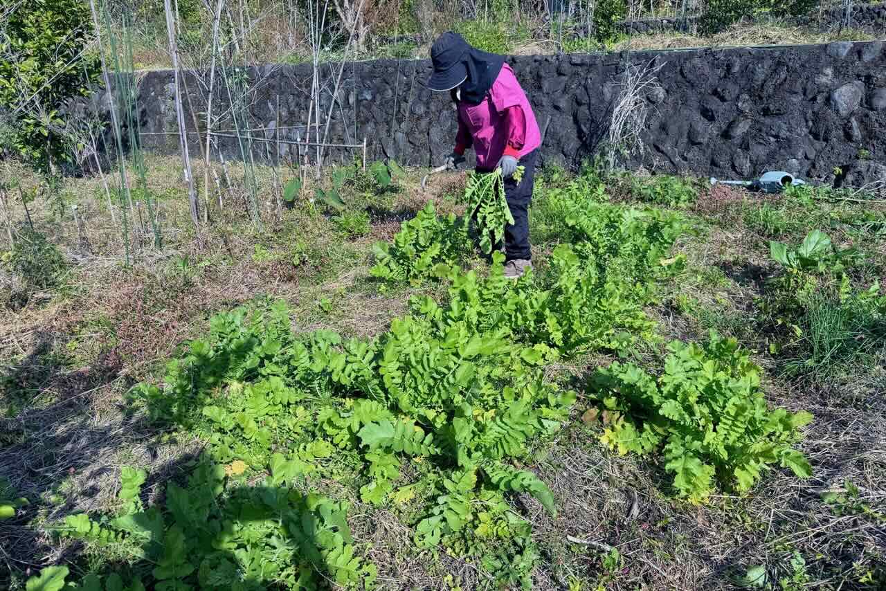 精進川の大根の種を繋いで蒔きましたので、赤い大根の種も混じっていたようです。いずれ全部収穫しないといけませんが、大量の葉っぱは湯がいてカットして冷凍にすればいつでも使えると塩谷さんが教えてくれました。塩谷さんは炒めで味付けしたものも冷凍にしているので、解凍してご飯の上に乗せると美味しいよと言ってました。