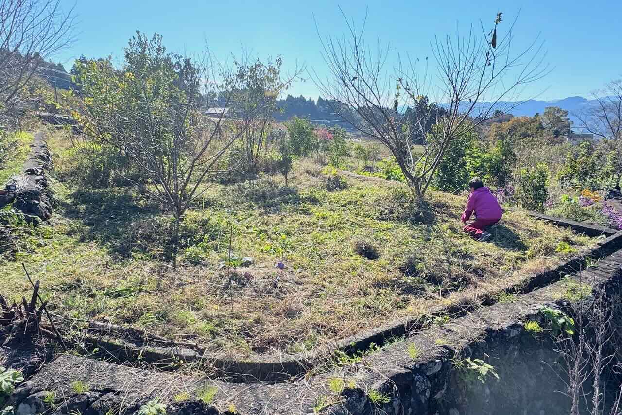 左の梅の木の後ろにレモンの木があり、その下にヘチマの種を2個植えて、ヘチマの実が3個木にぶら下がっていましたが、柳田さんはヘチマのつるを切ってしまいました。青い実が2個あったので残念ですがあまり気になりませんでした。毎年モウイやカボチャの実が塾す前に草を刈る時に一緒につるを刈ってしまいます。おちょこちょいですが、それ以上に一生懸命で明るい笑顔の絶えない人なので誰からも愛されます。
