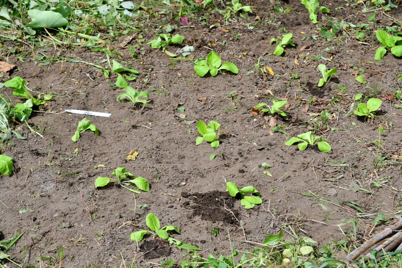 こちらはハクサイの苗です。他にもチマサンチュとサラダナの苗が育っています。9月2日にポットに種を蒔き、十分育ったので早く苗を移植したかったのですが、茶葉の乾燥から袋詰めまでの作業が優先だったので、今になりました。畑の仲間から上手に育っていると褒められました。精進川の畑の土をポットに入れて育てたからだと思います。庭にこぼれた精進川の畑の土にモンシロチョウが止まっていたのを思い出します。きっとエネルギーが強いのだと思います。