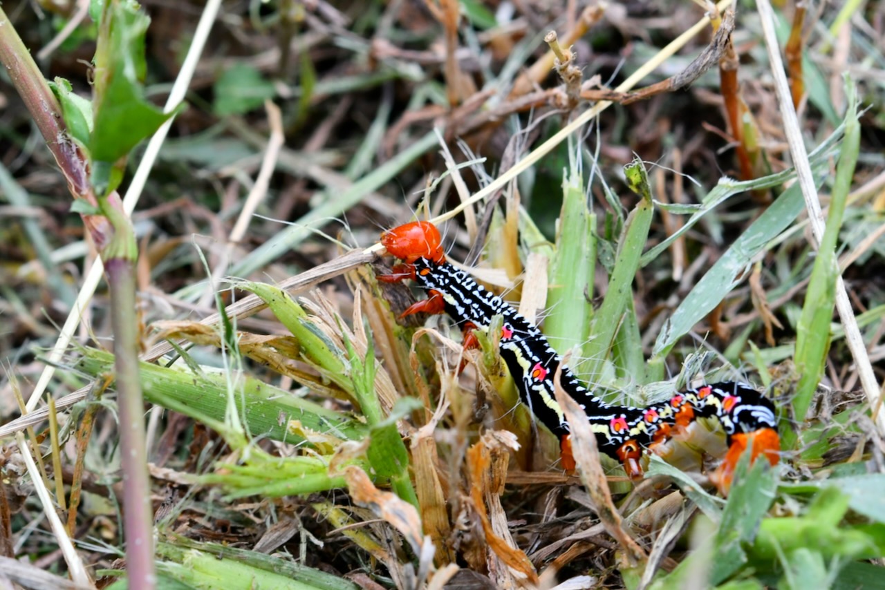 草を刈ると必死で逃げる子がいました。フクラスズメという蛾の幼虫です。結構スピードがあります。怖がらせてごめんね。住処を奪ってすみません。派手な見た目ですが、毒はありません。