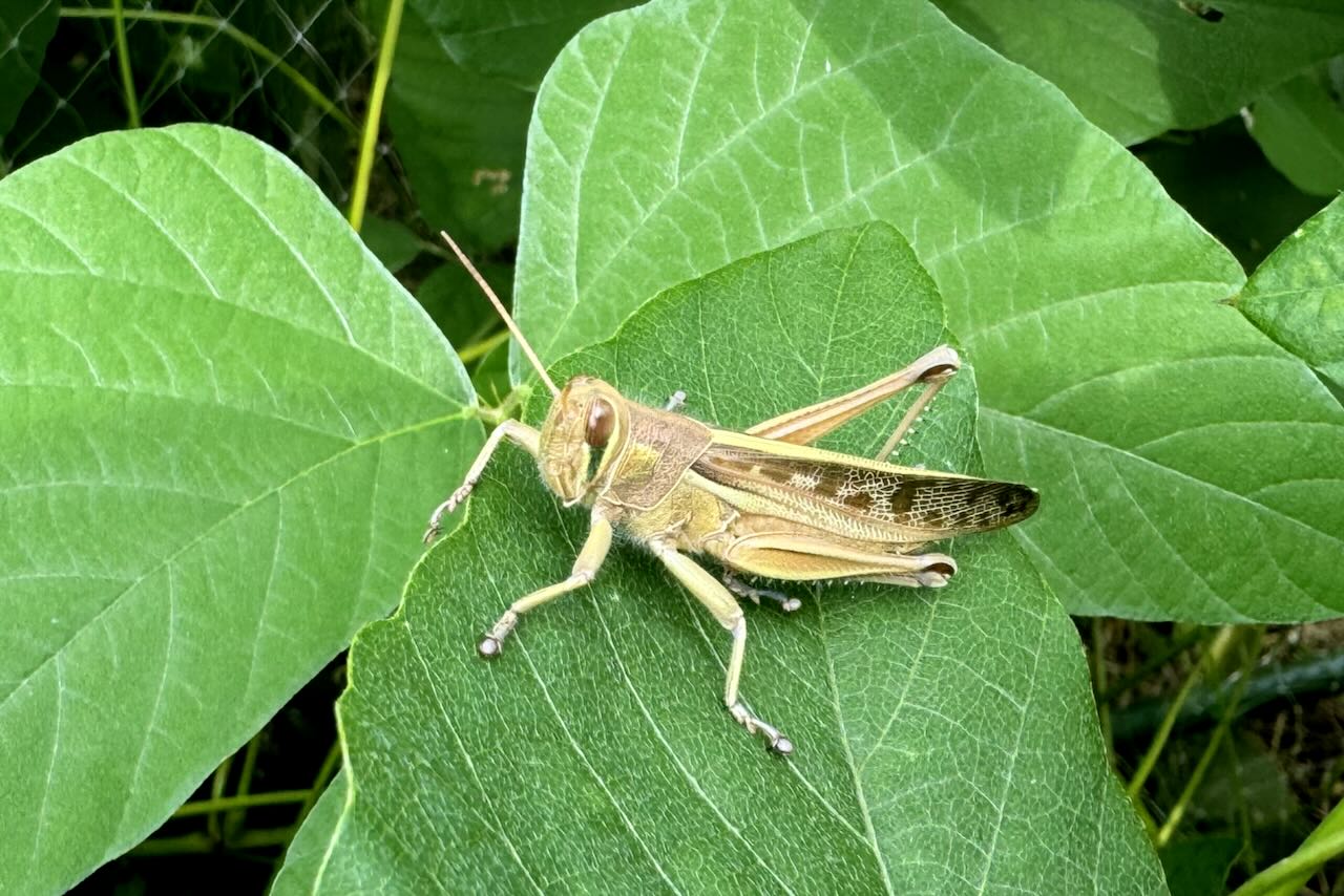 倒れたムクナ豆の葉にツチイナゴが止まっていました。。スマホしか持っていなかったのでスマホの接写機能で撮りました。この子はおとなしくて友好的なので、いくら近づいても撮らせてくれます。