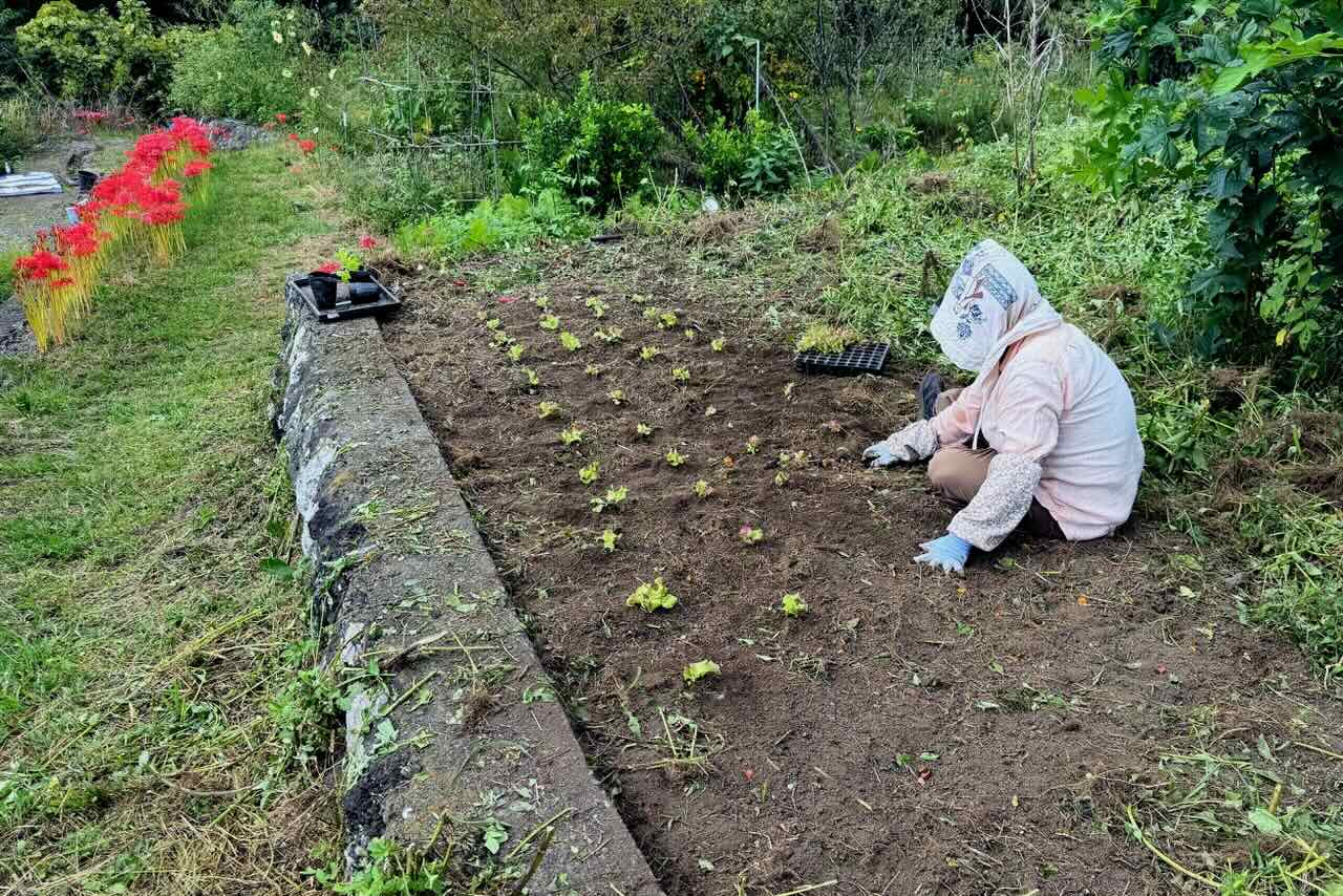 精進川の畑に白菜とサニーレタスの苗を植えました