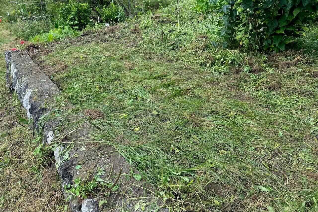 初めに通路の草刈りをして、苗を植える場所の草を刈りました。ここは協生キットがある畑で、端っこにトマトを植えていましたが、あっという間に草だらけになっていました。オオブタクサの成長が早くて驚きます。