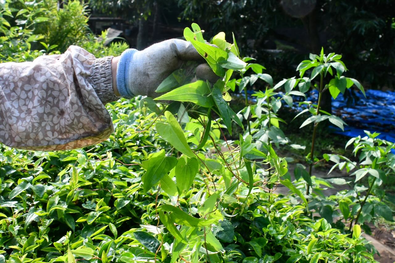 茶の木の上に這っているツルを引き剥がしています。