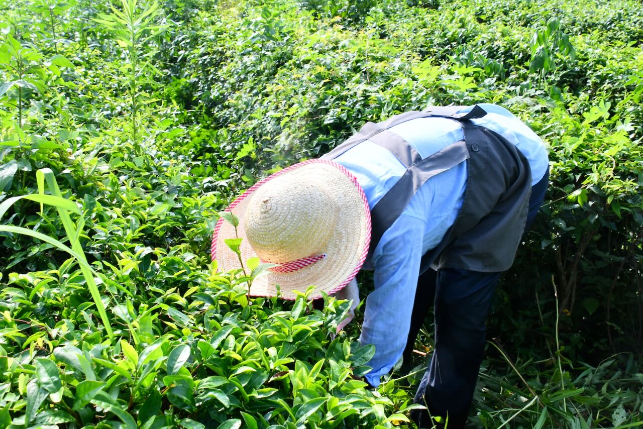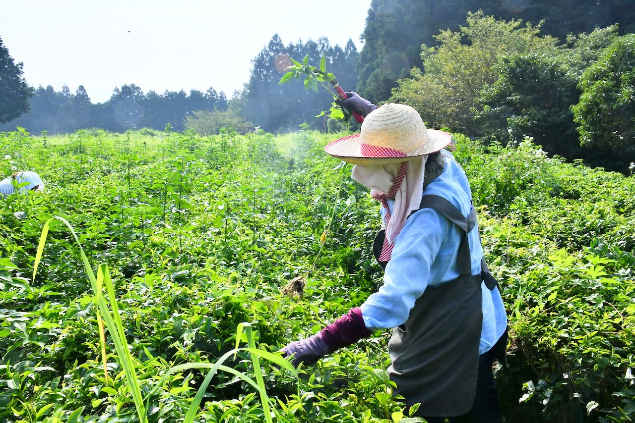 茶の木の中に生えている草を抜き取ります。