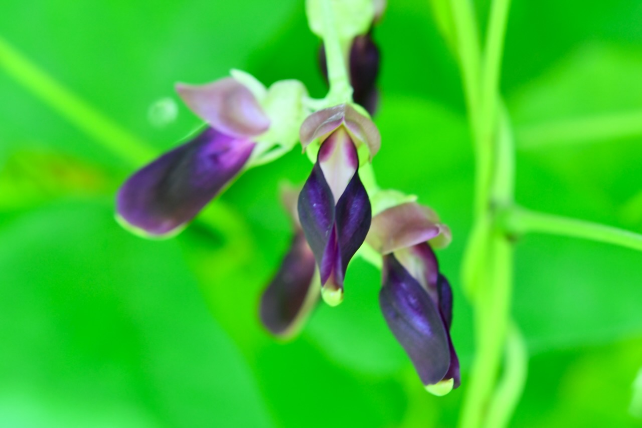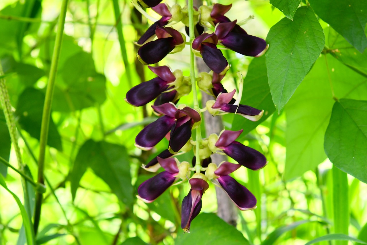 成長が早く葉が多く茂っているムクナ豆はまだ花の段階でした。上の葉が密集している場所は花が咲く場所もない感じで、葉の少ない下の方に花が咲いていました。