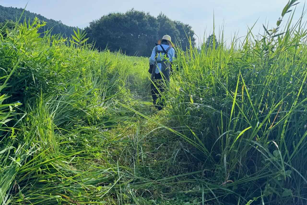 茶畑に行くには、まず草を刈って道を作るところから始めなければなりませんでした。茶畑に来るのは、6月20日に茶の木の剪定と草刈りをして以来です。9月1日に7人位で草を刈る予定ですが、草やツルがすごい事になっていると思いその前に様子を見るのを兼ねて女性陣4人で来ました。1時間ほどかけて5列ほど綺麗にすれば良いと軽く考えていたのですが、とんでもなくハードでした。