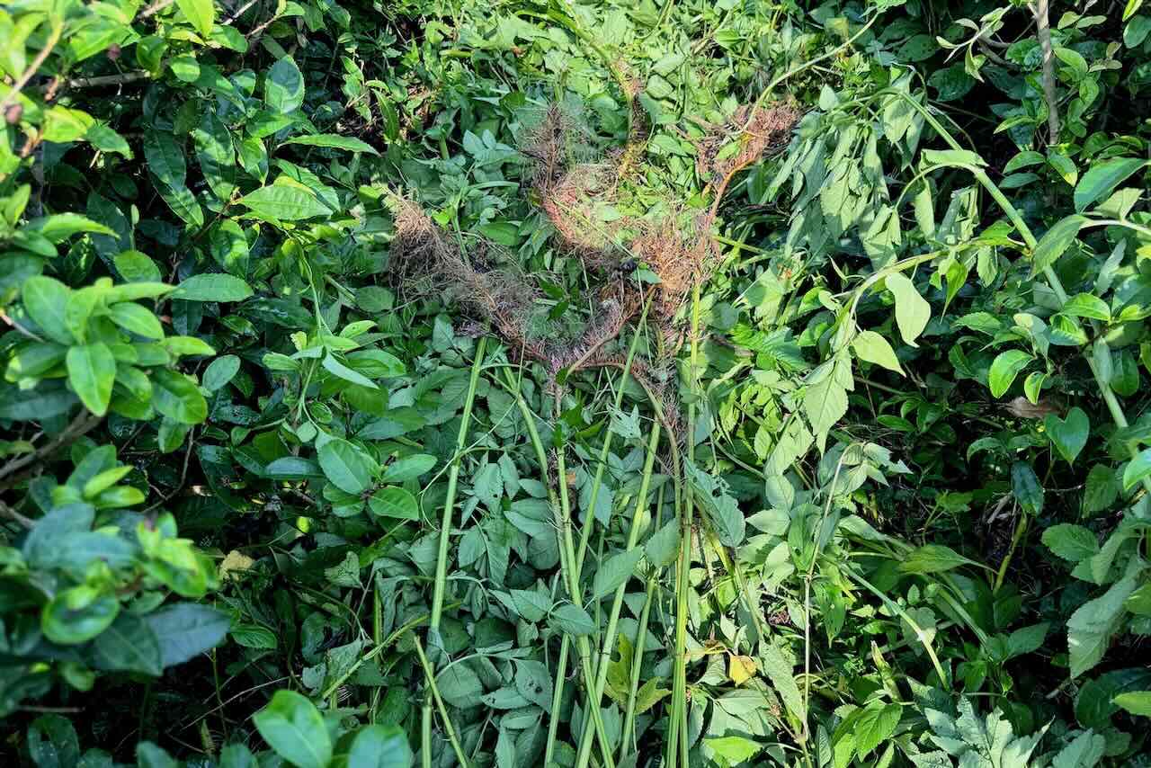私も茶の木の中やきわに生えているオオブタクサを引き抜きました。通路に生えているオオブタクサの根は地面を横に這っているので、引っ張るとズズズッと簡単に取れます。茶の木の中に生えている子は横に進めないので縦に生えていますが、それも簡単に引き抜けます。こんなに日照りが続いていますが、草に覆われて土は湿気って黒色です。どこも乾燥していません。