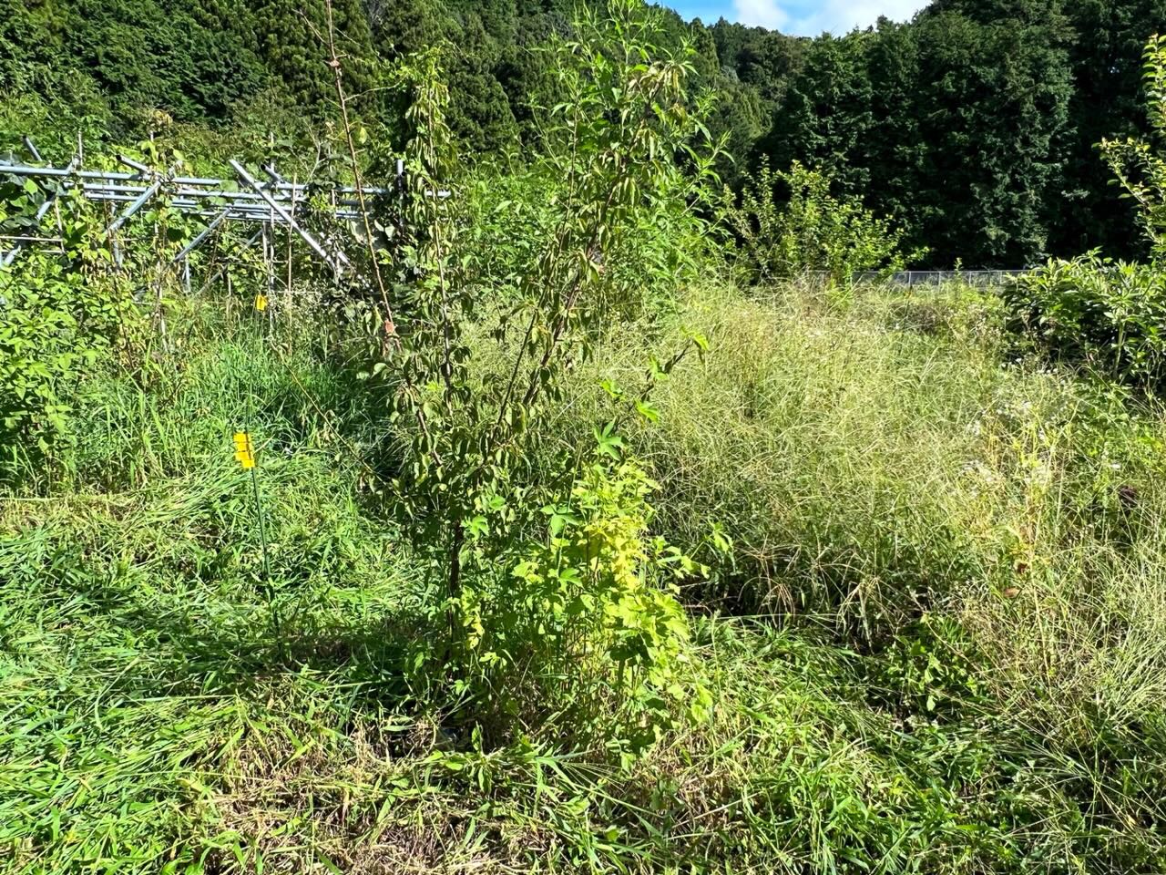 富士協生果樹農園が借りている大きな棚がある畑です。協生キットの果樹周りが草で覆われています。