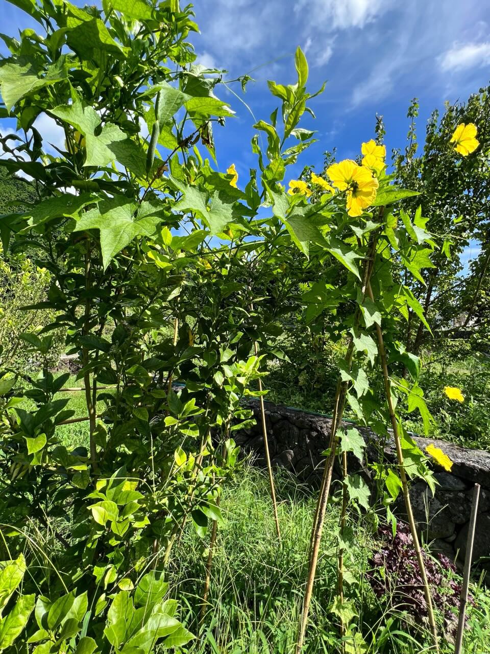 島オクラの実と花です。柔らかい方が美味しいので小さい子も収穫しました。