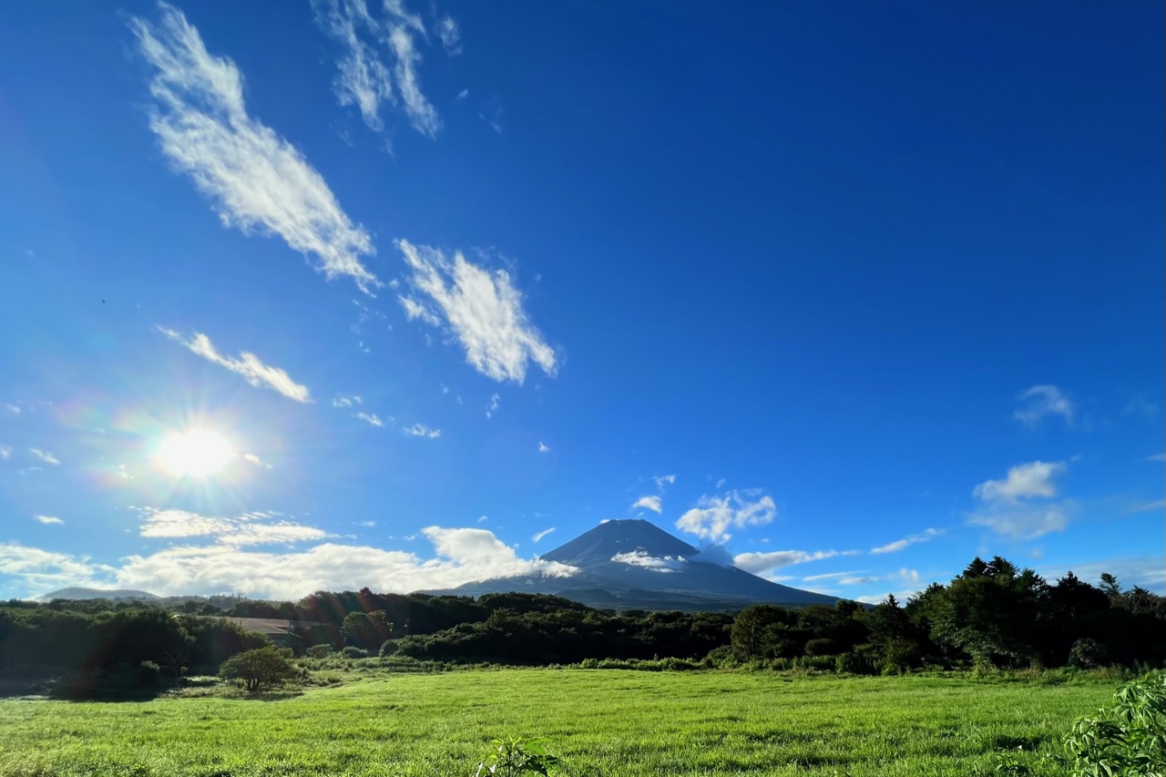 8日6時30分の富士山です。富士北麓の富士河口湖町を出た時は曇り空で、地面も夜中に降った雨で濡れていました。それが富士西麓に入ると、急に青空が広がりました。