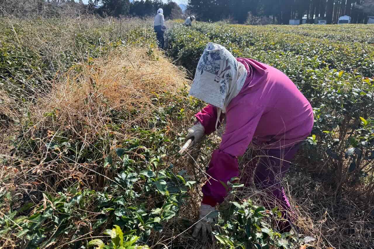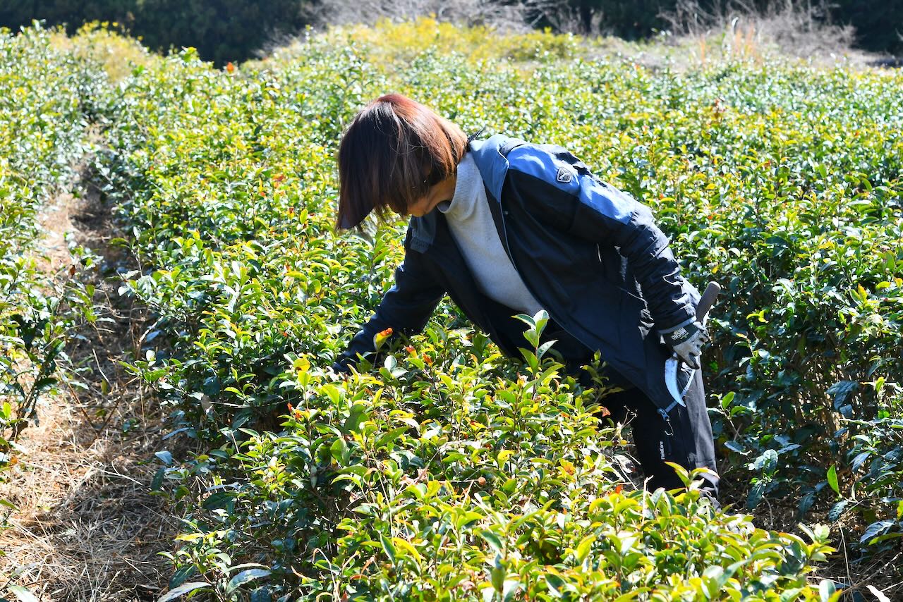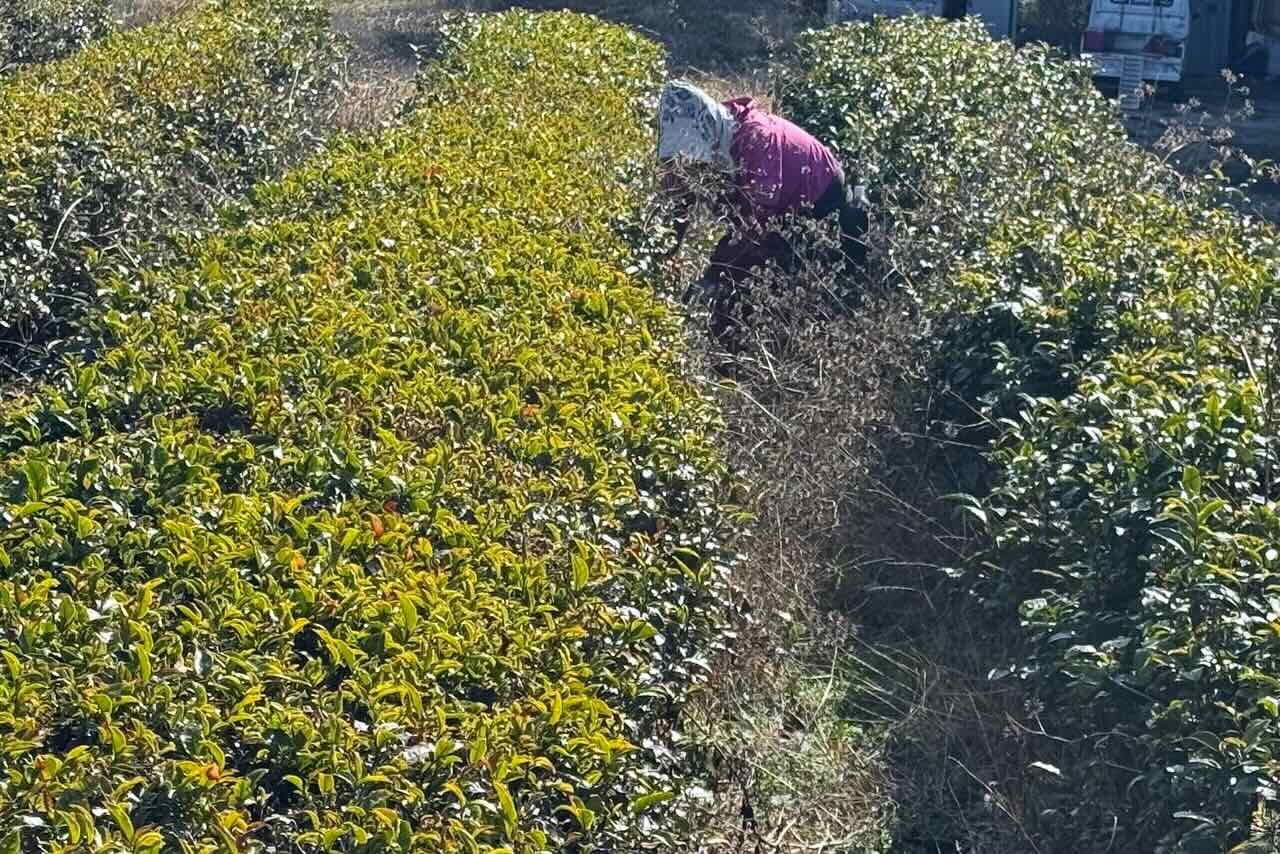 淑さんが茶の木の中に生えている草を抜き取っています。