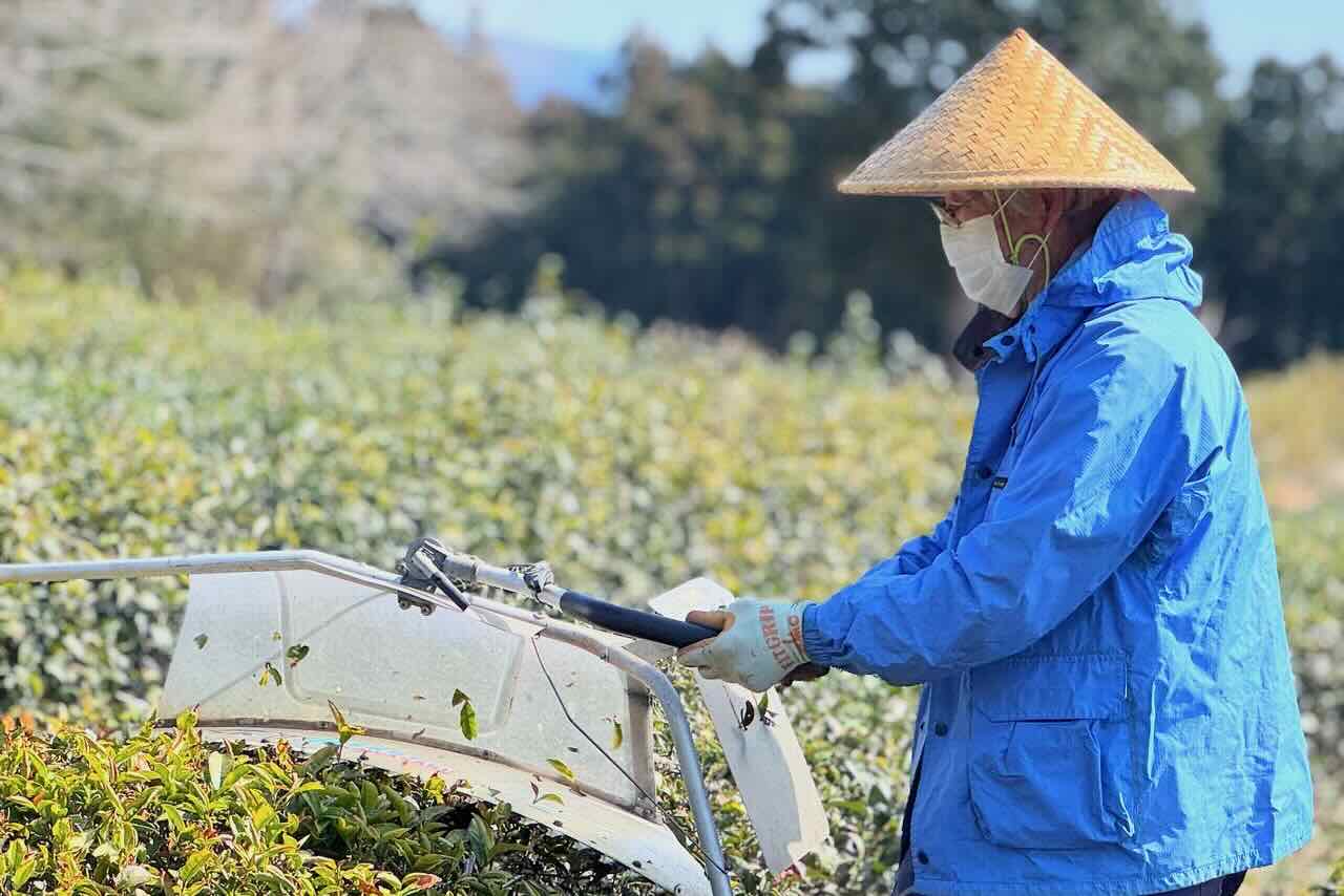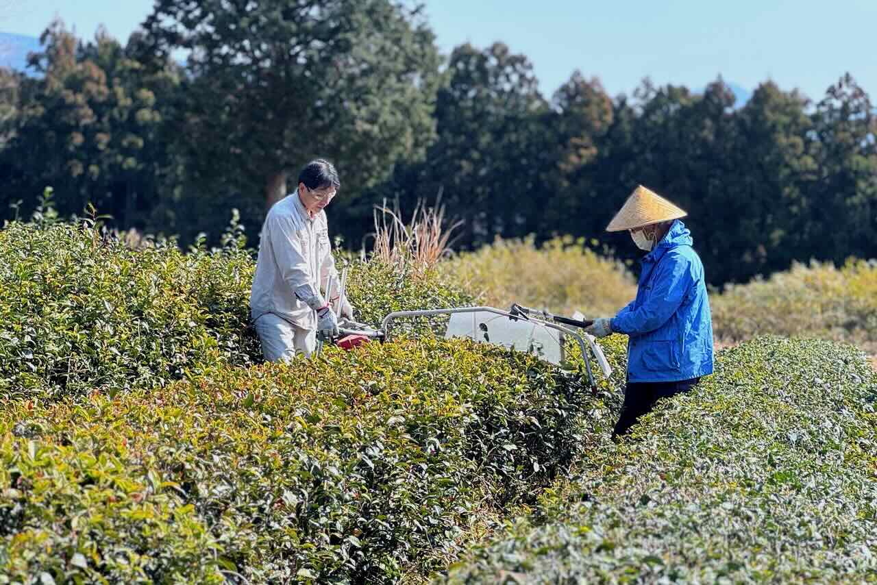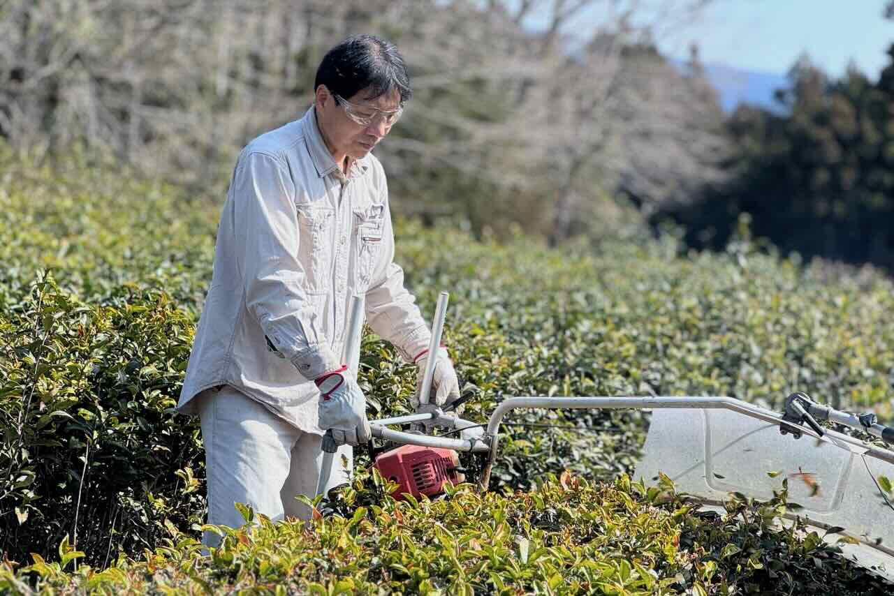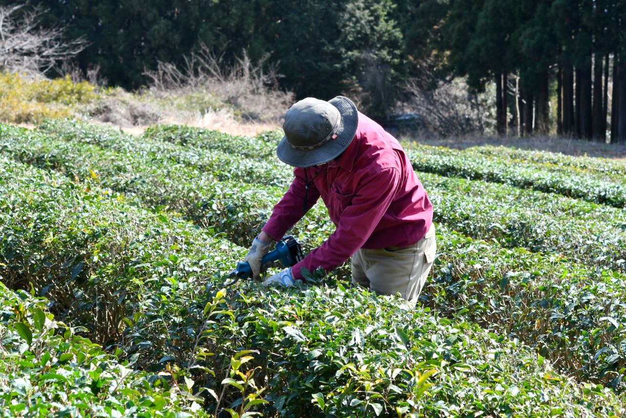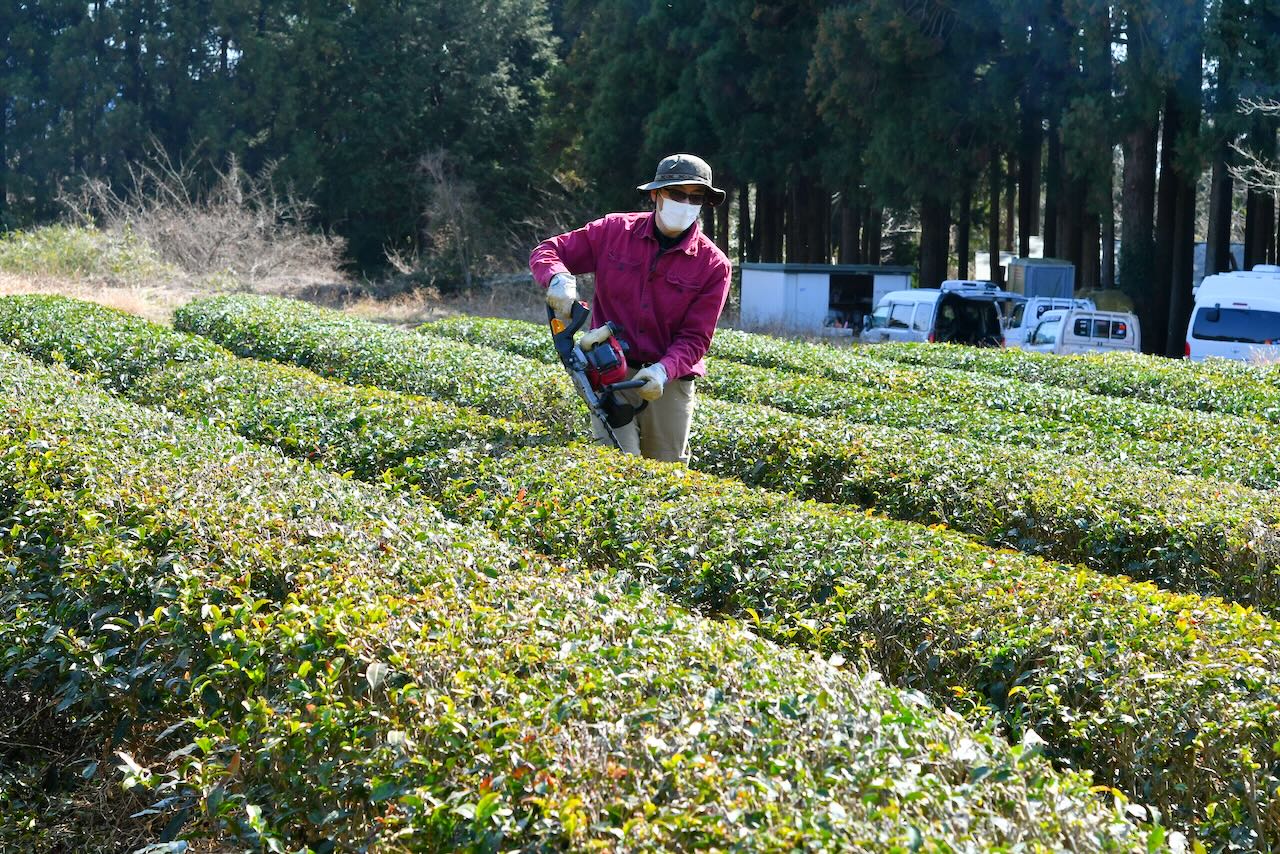 手塚君が、草刈機で茶の木のサイドを刈っていきましょうか?と聞いてくれたのでお願いしました。草刈機を上から下に振り下ろしたり。逆に下から上に振り上げて横の枝を刈ります。奥で塩谷さんが感心して思わず見ています。塩谷さんは自分もやろうとしたけれど重くて出来なかったと言っていました。やはり男性の力はすごいです。手塚君は横の枝だけではなく、上に伸びすぎた枝も刈ってくれました。奥の8列は昨年剪定していないので上に長く伸びていました。安田さんがとても助かったと後から教えてくれました。伸びすぎた枝は剪定機で刈ると、すぐに枝を受ける口がいっぱいになるので、止まって溜まった枝を捨てる作業を頻繁にしなくてはいけなくなるのですが、手塚君が刈ってくれたおかげでその手間がだいぶ省けたそうです。誰に言われなくても作業を見て何が必要か気づき行動出来るのは素晴らしいです。