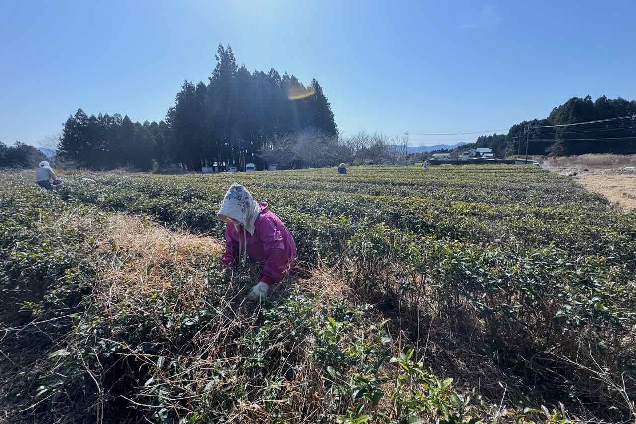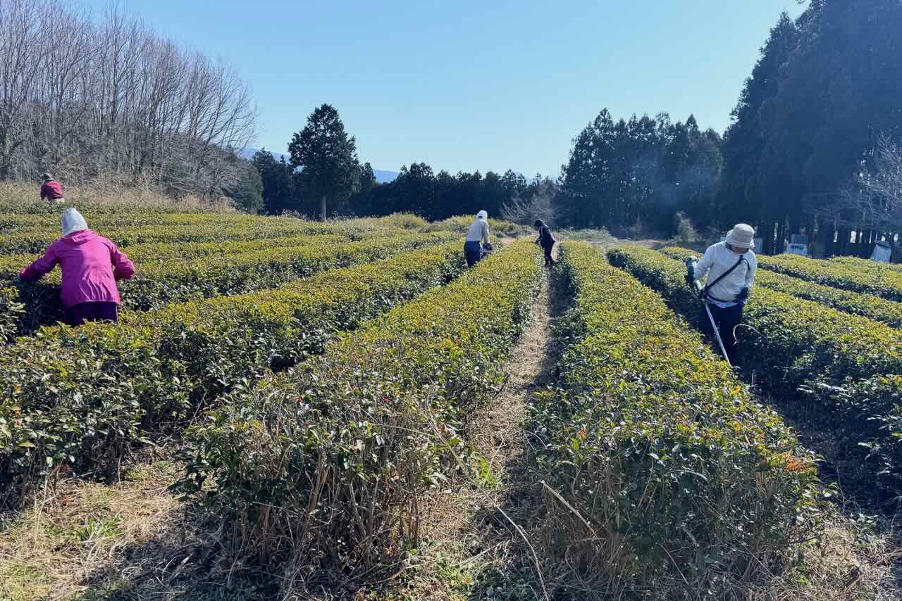 茶畑けの通路を、草刈機4人と手鎌4人で刈って行きました。柳田さんが通路の草を抜いています。