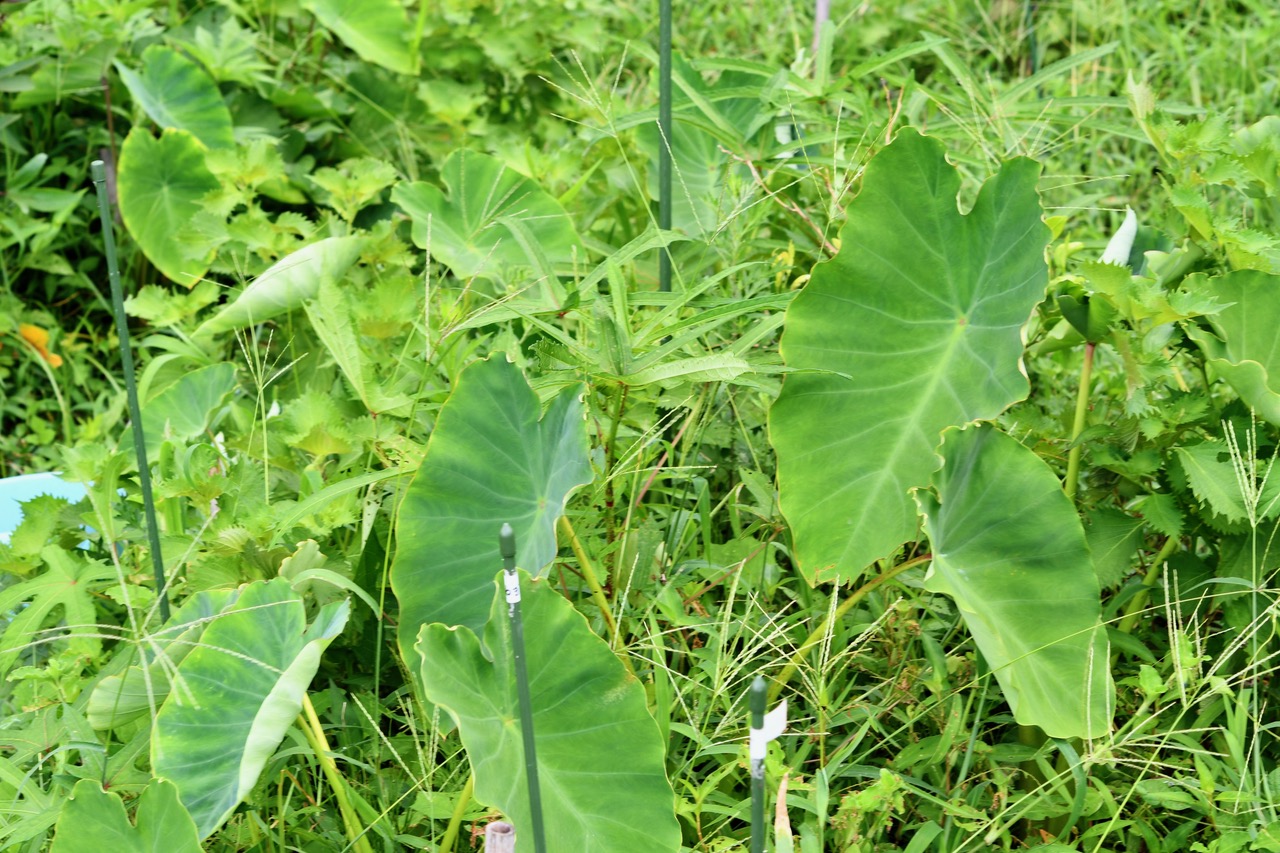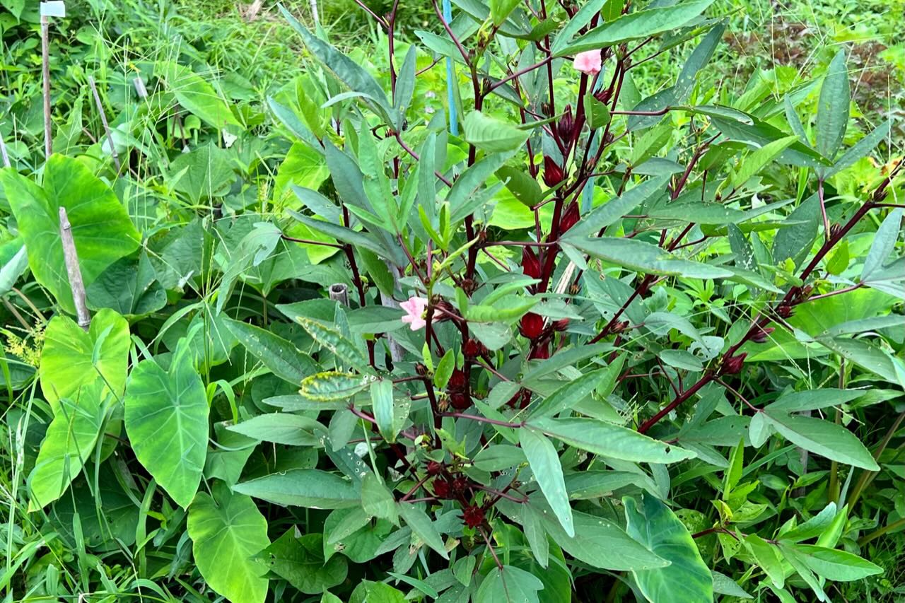 この小さな畝には、1本のローゼルとその周りにサトイモとサツマイモを植えています。
