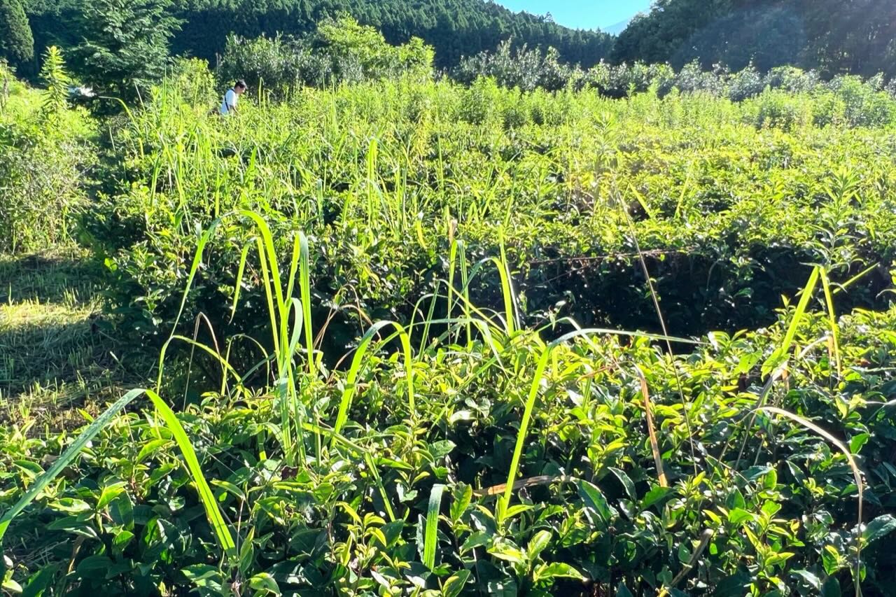 7月28日に上杉君が茶畑の通路を11列草刈りをしてくれましたが、今日は中村君が残りの通路を草刈機で刈ってくれています。それにしても草がすごいことになっています。