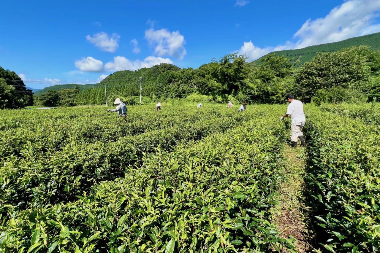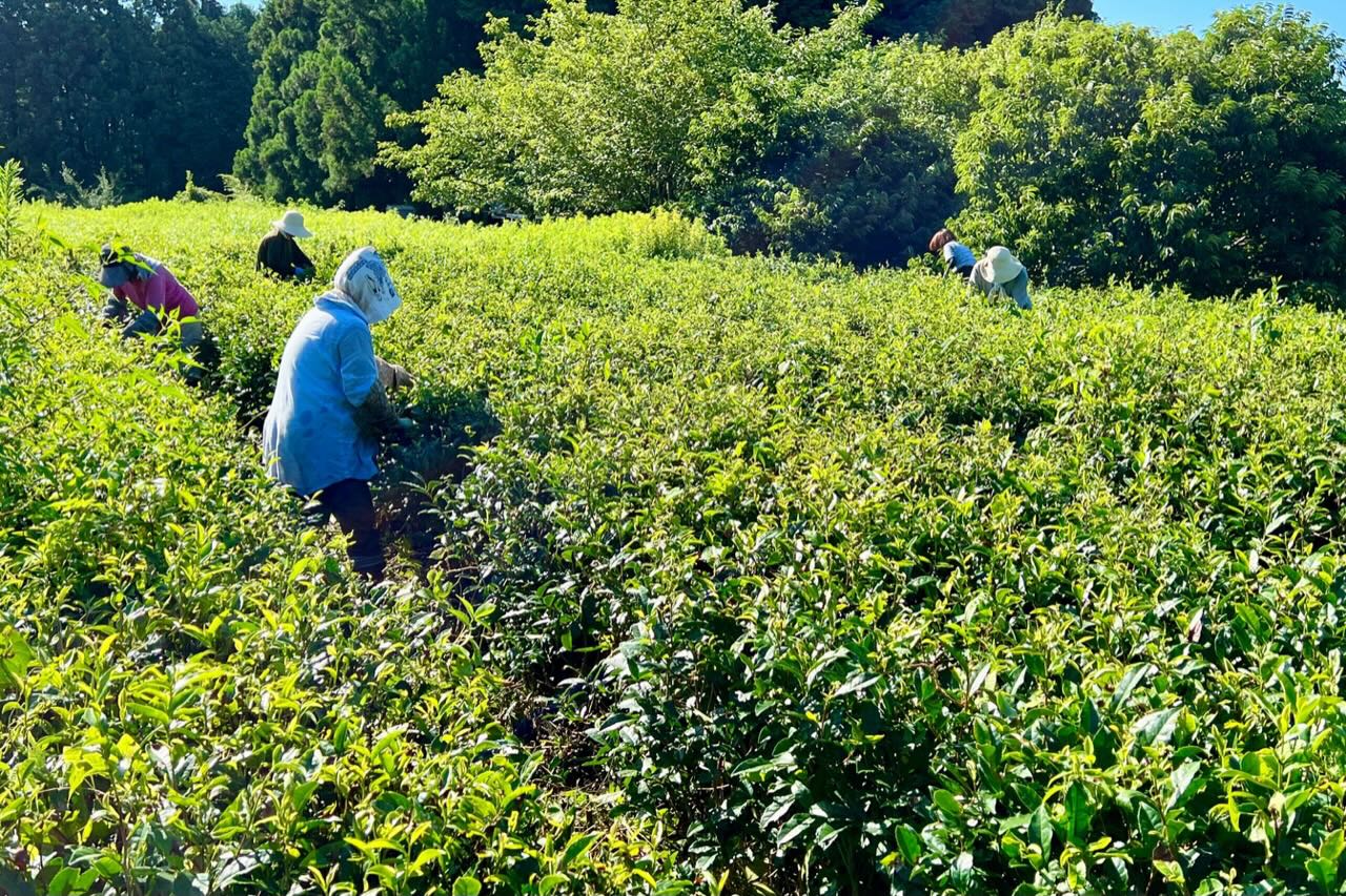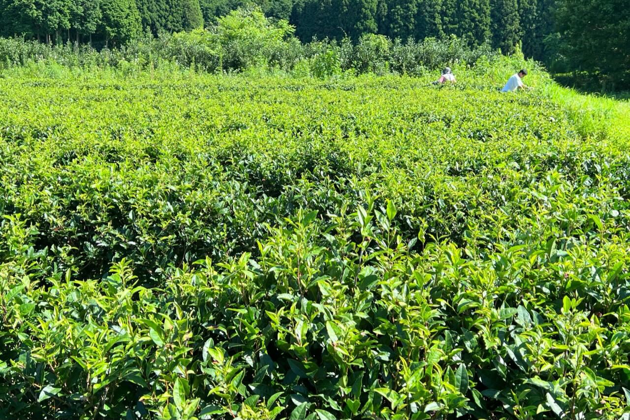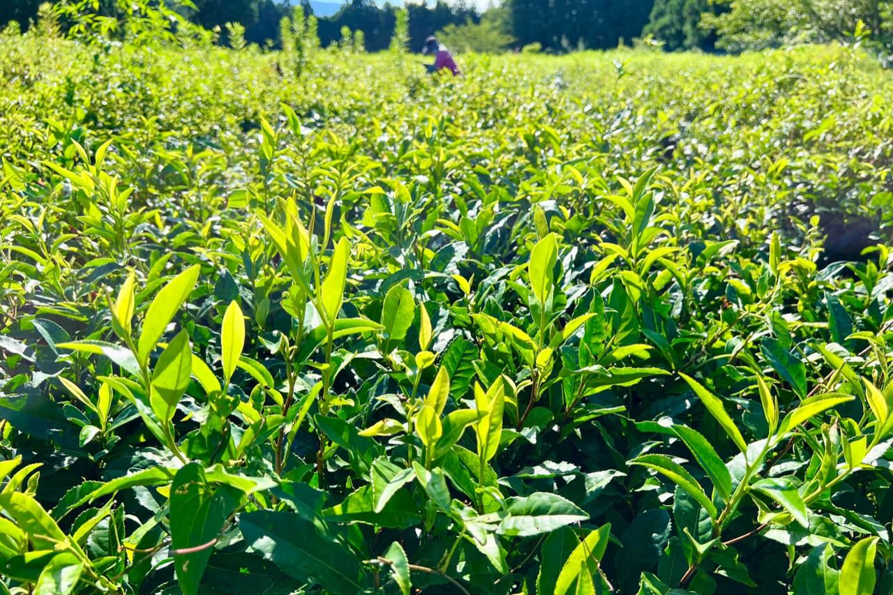 今の茶葉は硬いです。日照りで茶色くなった葉もまじっています。中村君と相談して、2列ほどは茶摘み機で茶葉を摘み、皆んなで分けて各自で天日干しをして日干番茶を作って味見しても良いねと話しました。残りは全部剪定機で刈り込んで、10月に少しでも秋冬番茶を収穫できたら良いかもねと話しました。これからどうするか上杉君とも相談です。