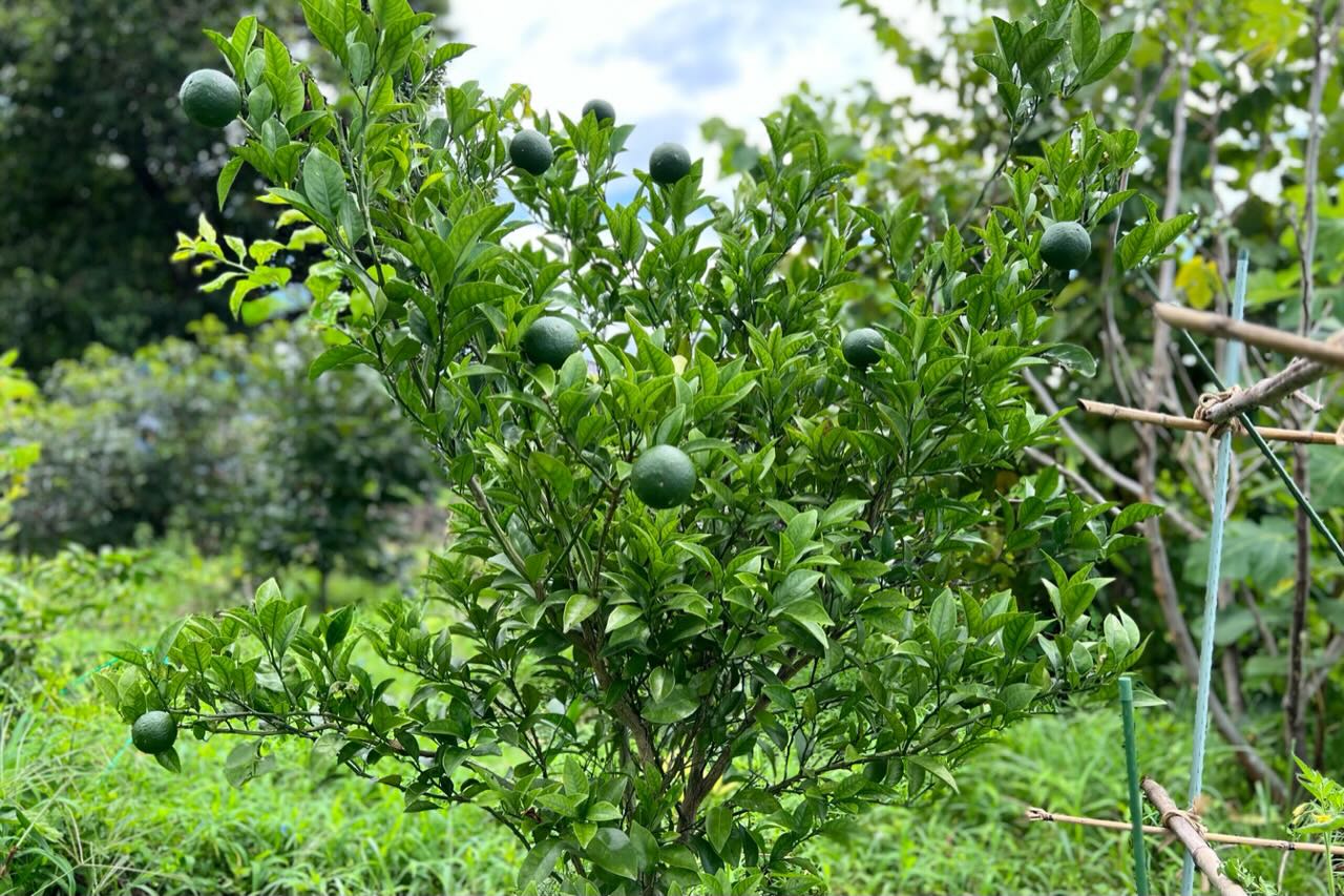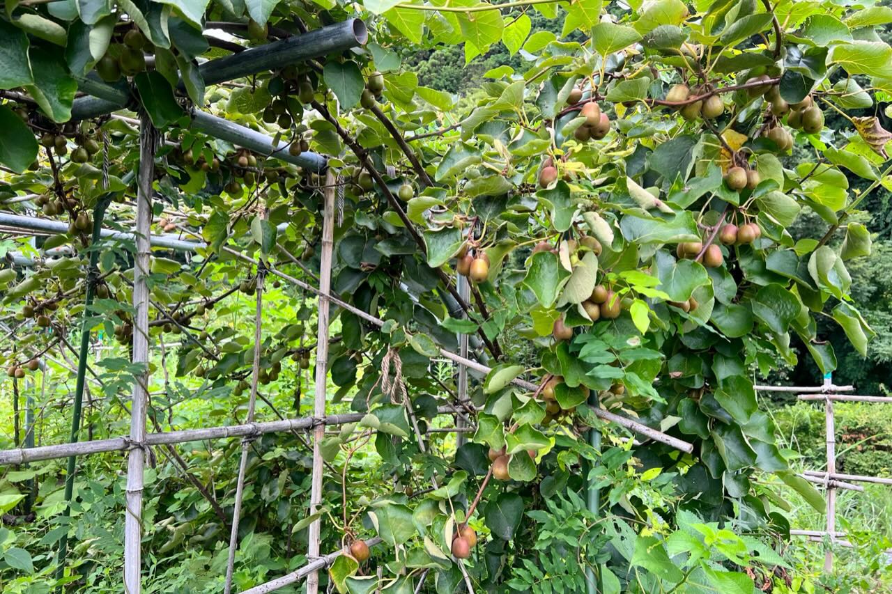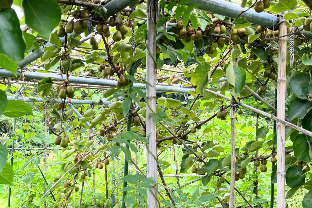 梅の古木がある畑です。キウイがタワワですが、棚の外に伸びているキウイはよく日が当たるので色付いています。